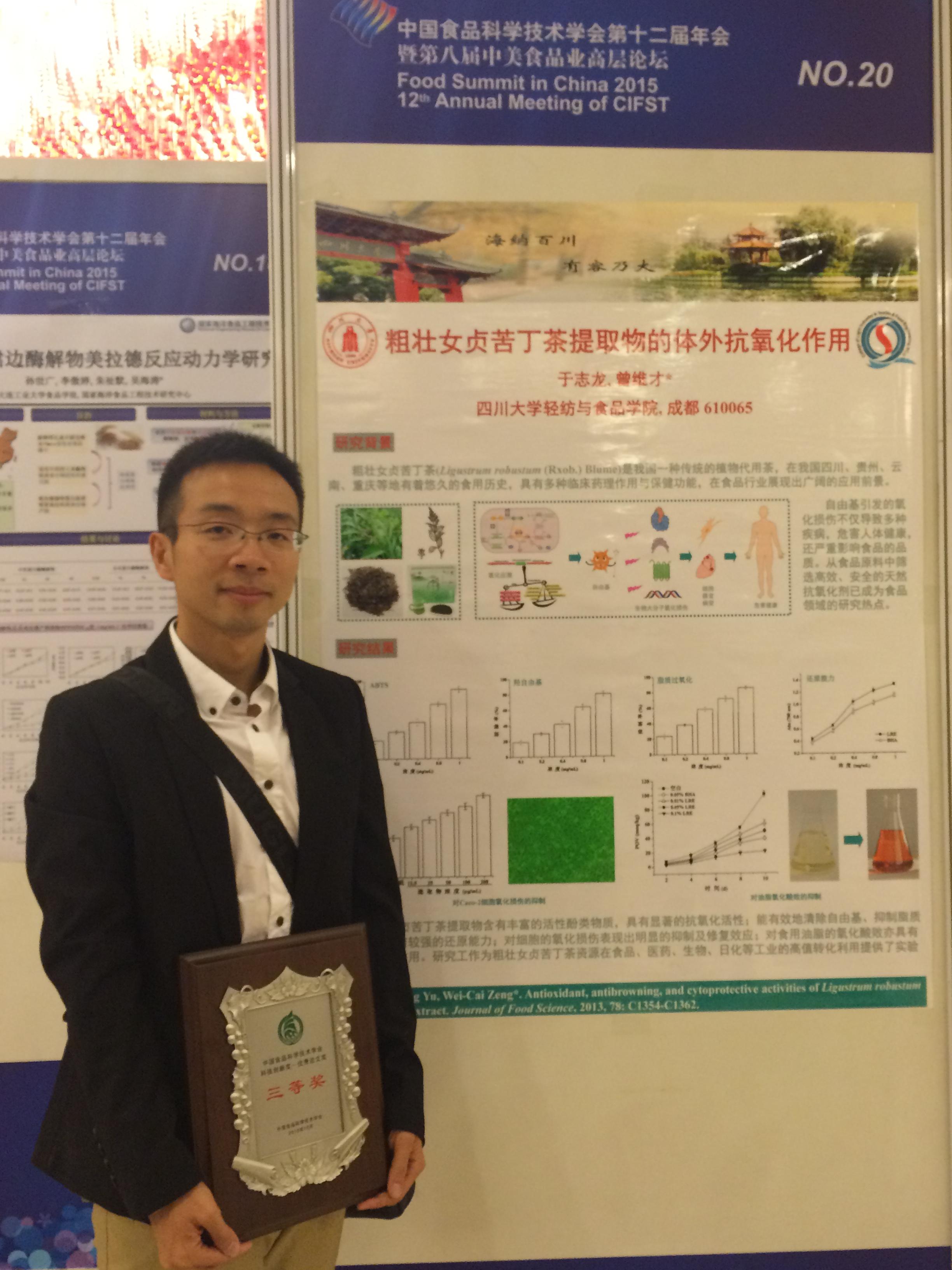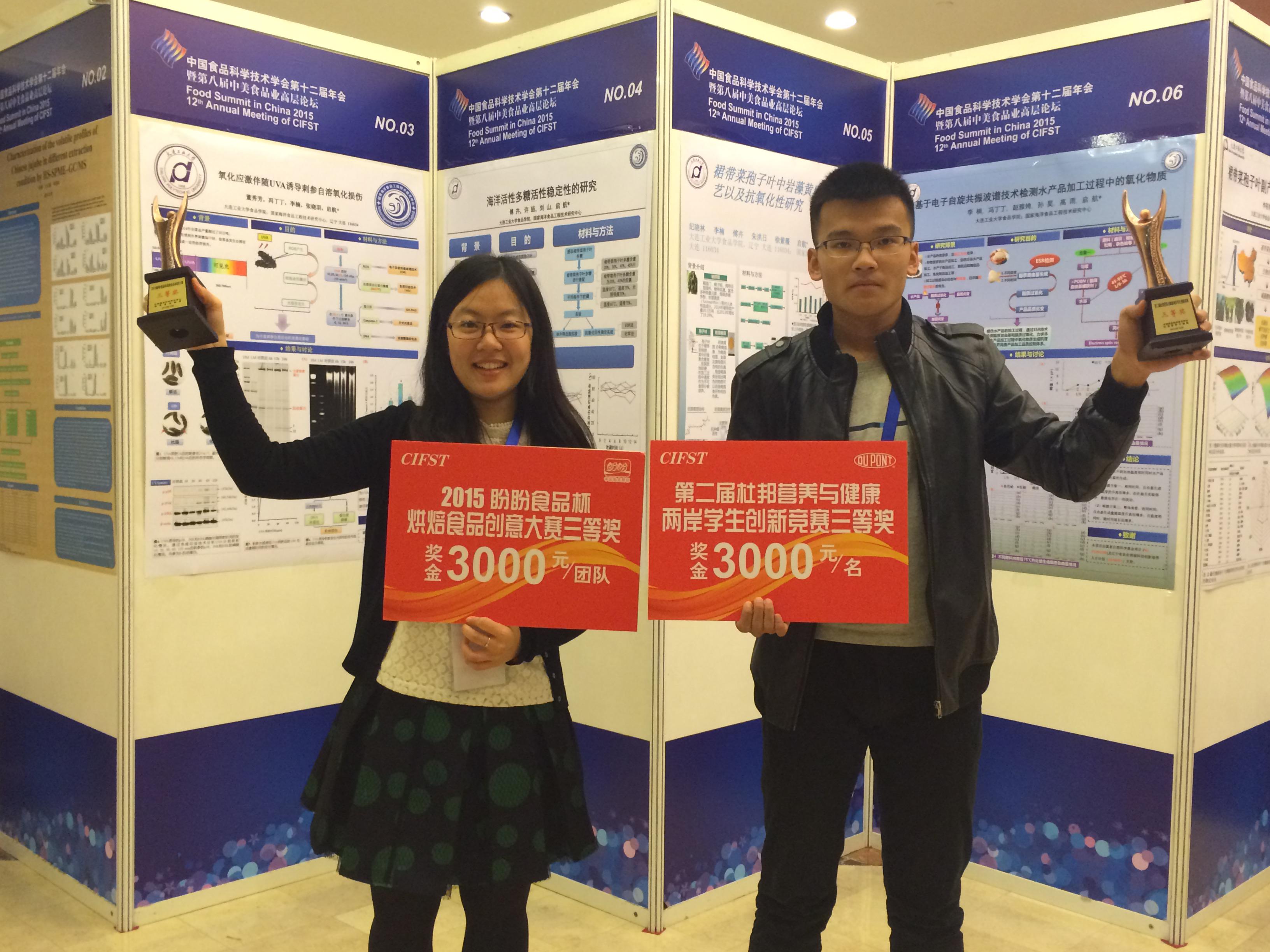 曾维才老师的论文《粗壮女贞苦丁茶提取物的体外抗氧化作用》荣获中国食品科学技术学会科技创新奖三等奖。邱琛等同学设计的作品《棋妙》荣获“2015盼盼食品杯烘焙食品创意大赛”三等奖;马健等同学设计的作品《川菇粮》荣获“第二届杜邦营养与健康两岸学生创新竞赛”三等奖;薛凡等同学设计的作品《追“球”》荣获“2015盼盼食品杯烘焙食品创意大赛”优秀奖。特此祝贺!