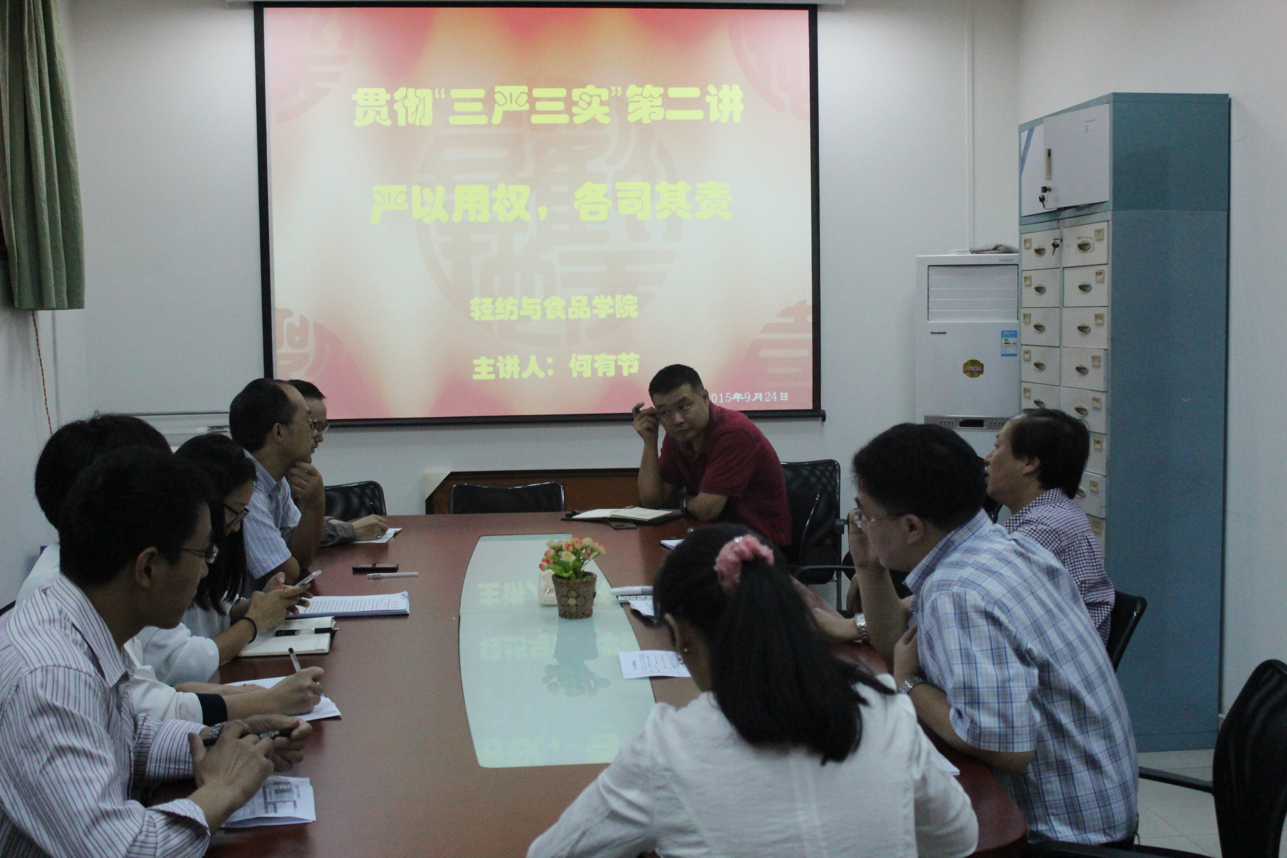 9月24日上午,羞羞漫画 在纺工副楼201会议室举行“三严三实”第二讲“严以用权”专题讲座。本次讲座由院长何有节教授主讲。学院中层领导干部、院长助理、科级干部、教职工党支部书记和学生党支部书记参加此次讲座。何院长以“严以用权、各司其职”为题,从个人对“严以用权”的理解,自身存在问题的分析和整改思路三个方面作报告。报告深入浅出、剖析深刻,与会人员结合自身工作谈了谈学习这个专题的感触。通过本次讲座,与会人员都表示对本专题有了更深入的体会和理解。