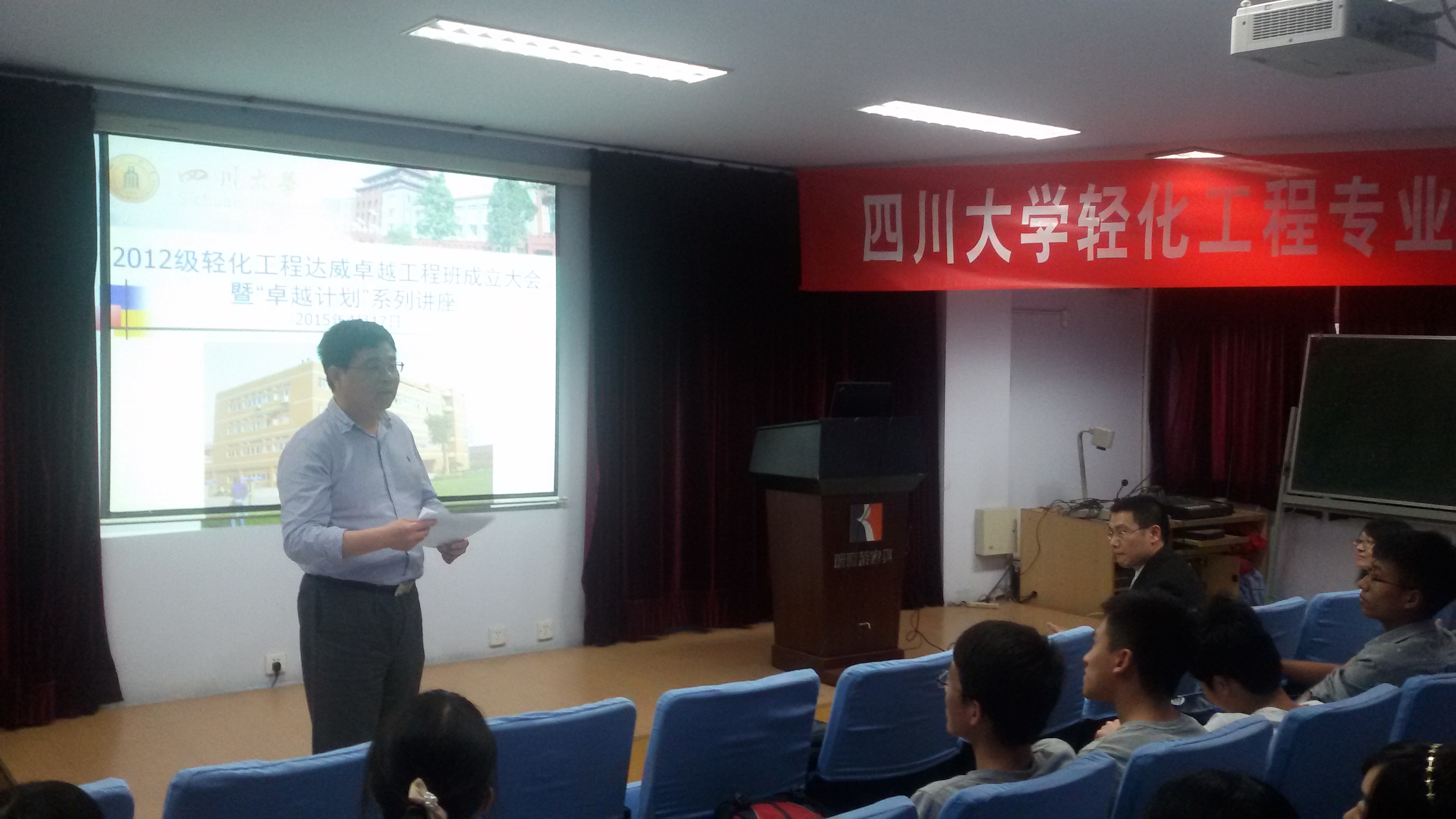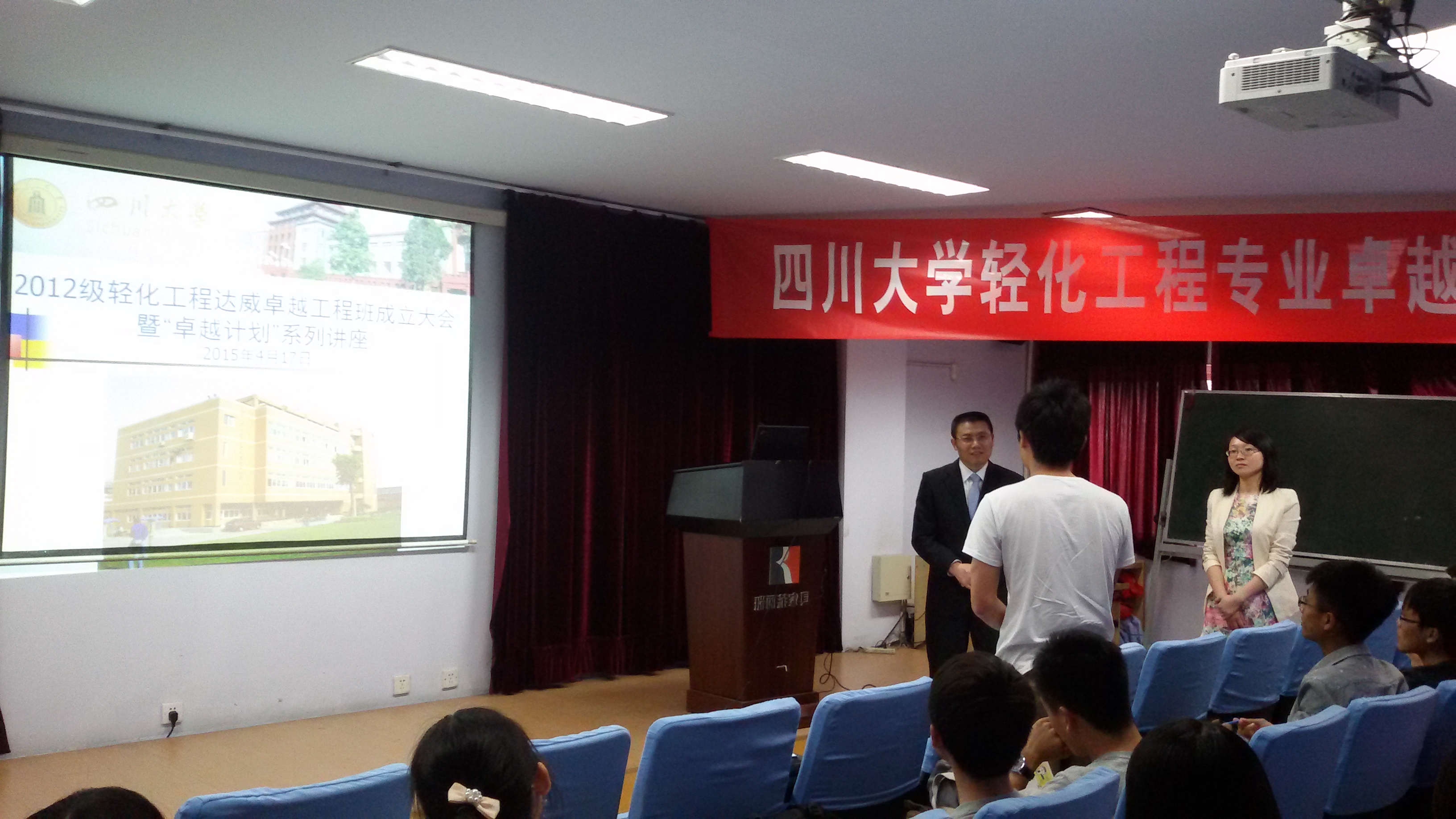 参加达威卓越工程师班成立大会的有四川达威科技股份有限公司副总经理曾晓林先生、生物质与皮革工程系主管教学的系主任彭必雨教授、对外联络办主任周华龙教授、达威科技股份有限公司人力资源部王疏影经理。2012级轻化工程专业卓越班的37位同学参加了大会。会议由轻纺与食品学院院长、生物质与皮革工程系主任何有节主持。