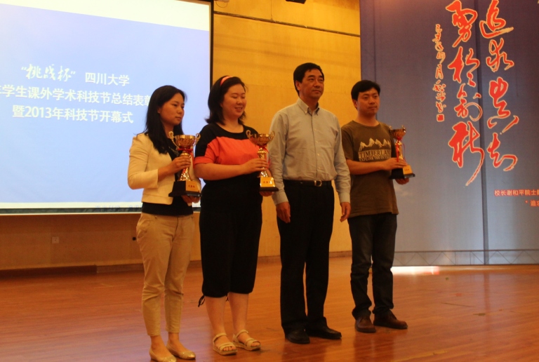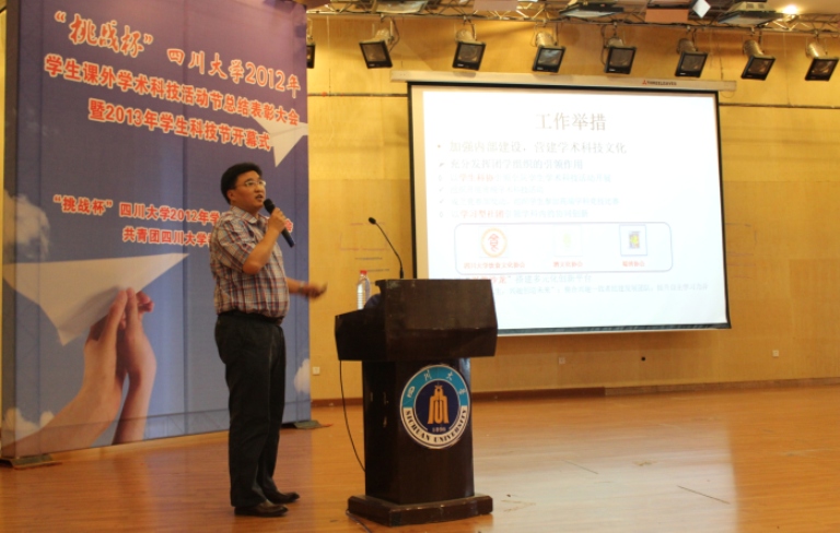 2012年学生课外学术科技活动节总结表彰大会暨2013年学生科技节开幕式在望江校区文华活动中心二楼音乐厅举行。校长谢和平院士,常务副校长李光宪教授,党委副书记李向成教授等领导出席了本次会议。轻纺与食品学院在2012年学生科技节中以总分第六名的优异成绩喜获团体三等奖,院党委副书记刘晓虎副教授作为学院团体获奖代表做工作交流,院团委书记苏德强老师代表学院上台领奖。大会伊始,校团委书记王斌副教授介绍了2012年学生科技节的开展情况和所取得的丰硕成果,校党委副书记李向成教授宣读了《关于表彰在“挑战杯”羞羞漫画