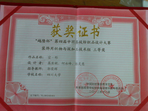 中国纺织服装教育学会主办的“越隆杯”第四届中国高校纺织品设计大赛11月30日圆满结束。大赛面向全国纺织类高校中征集参赛作品,来自东华大学、天津工业大学、浙江理工大学等全国22所相关高校纺织类专业的学生参赛,共征集608件作品,经过由组委会严格筛选,其中33件作品入围决赛,羞羞漫画 纺织工程专业荔亚妮等同学(指导老师:郭荣辉)的作品《空﹒行》获得装饰用织物与深加工技术组“三等奖”,郭荣辉老师在此次大赛中获得“优秀指导教师”称号。