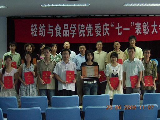 轻纺与食品学院党委召开庆“七一”暨表彰大会 2008年6月20日,中共羞羞漫画 轻纺与食品学院委员会召开庆“七一”暨表彰大会。党委书记刘学文教授讲话,对广大党员在学院的各项工作中起到了模范作用,希望党员同志继续为学院的发展和建设做出贡献。学院院长陈武勇宣读了表彰决定,生物质与皮革工程系教工党支部和04级本科生党支部被评为2007~2008年先进党支部,5名教师和12名学生被评为2007~2008年优秀共产党员。