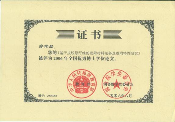 石碧教授指导的廖学品博士论文“基于皮胶原纤维的吸附材料制备及吸附特性研究”被评为2006年全国百篇优秀博士论文。该论文创造性的以皮胶原纤维为基础材料,制备出了两类具有重要应用前景的新型吸附材料,分别用于中草药制剂中单宁的高选择性脱除和水体中有毒重金属离子的去除。研究工作拓展了皮革化学与工程学科的研究方向,为皮胶原这一丰富的可再生资源的开发利用提供了新的方法,得到国际同行的认可。在博士论文研究期间发表SCI收录论文11篇,获得国家发明专利2项。