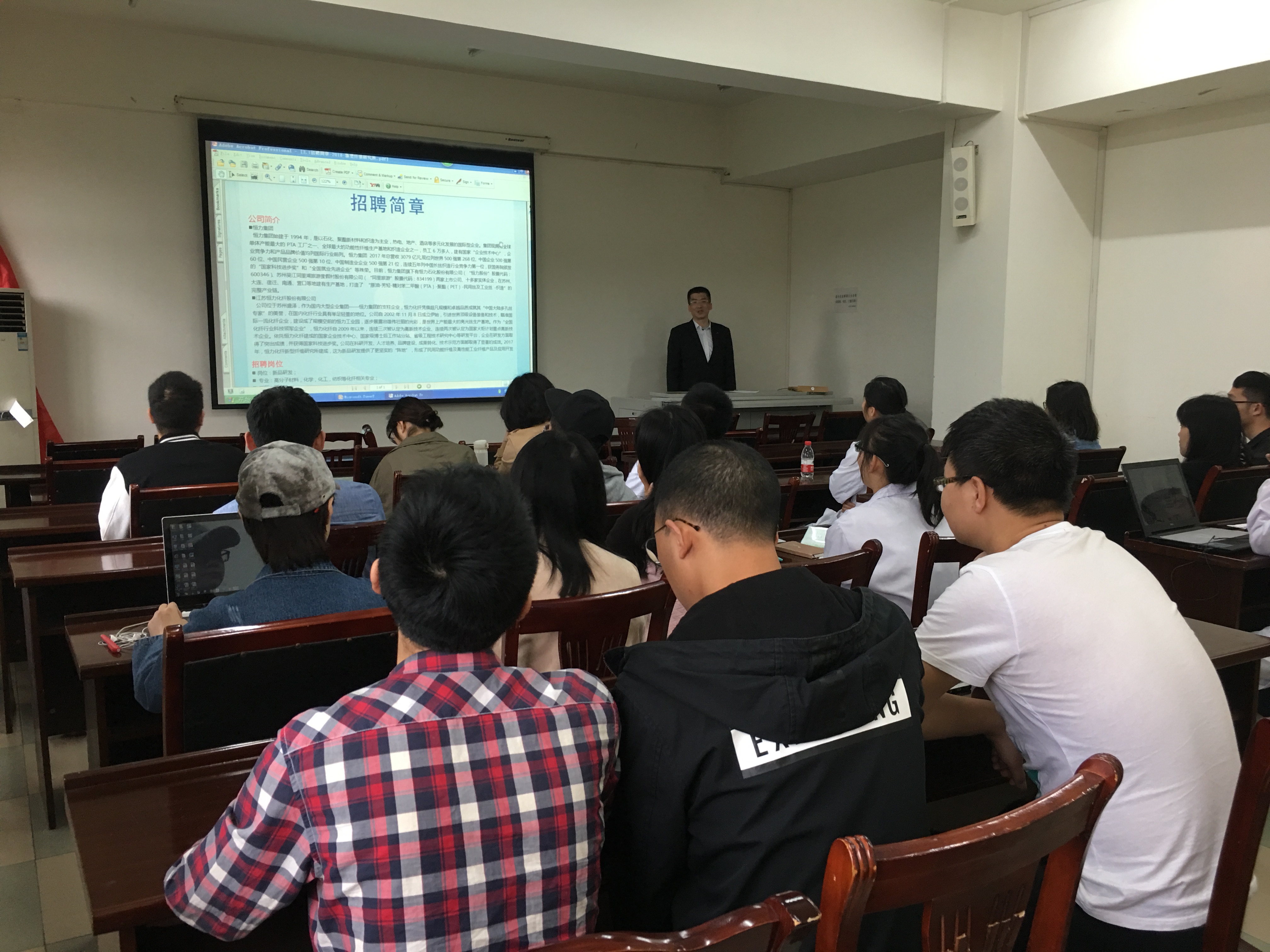 、轻纺与食品学院及纺织与服装工程系的基本情况、人才培养、科学研究方向、就业等做了介绍,恒力集团对集团公司基本情况、研究院、研究所进行介绍,就双方的科研合作进行探讨。同时,新型纤维研究所王永锋副所长向本科生和研究生宣讲恒力集团、化纤股份有限公司基本情况、公司业绩、员工待遇、福利、公司文化等,并对本科生和研究生招聘岗位、福利待遇等进行说明。学生听了讲座后,对世界500强恒力集团进行了全面的了解,讲座后部分同学投递了简历。