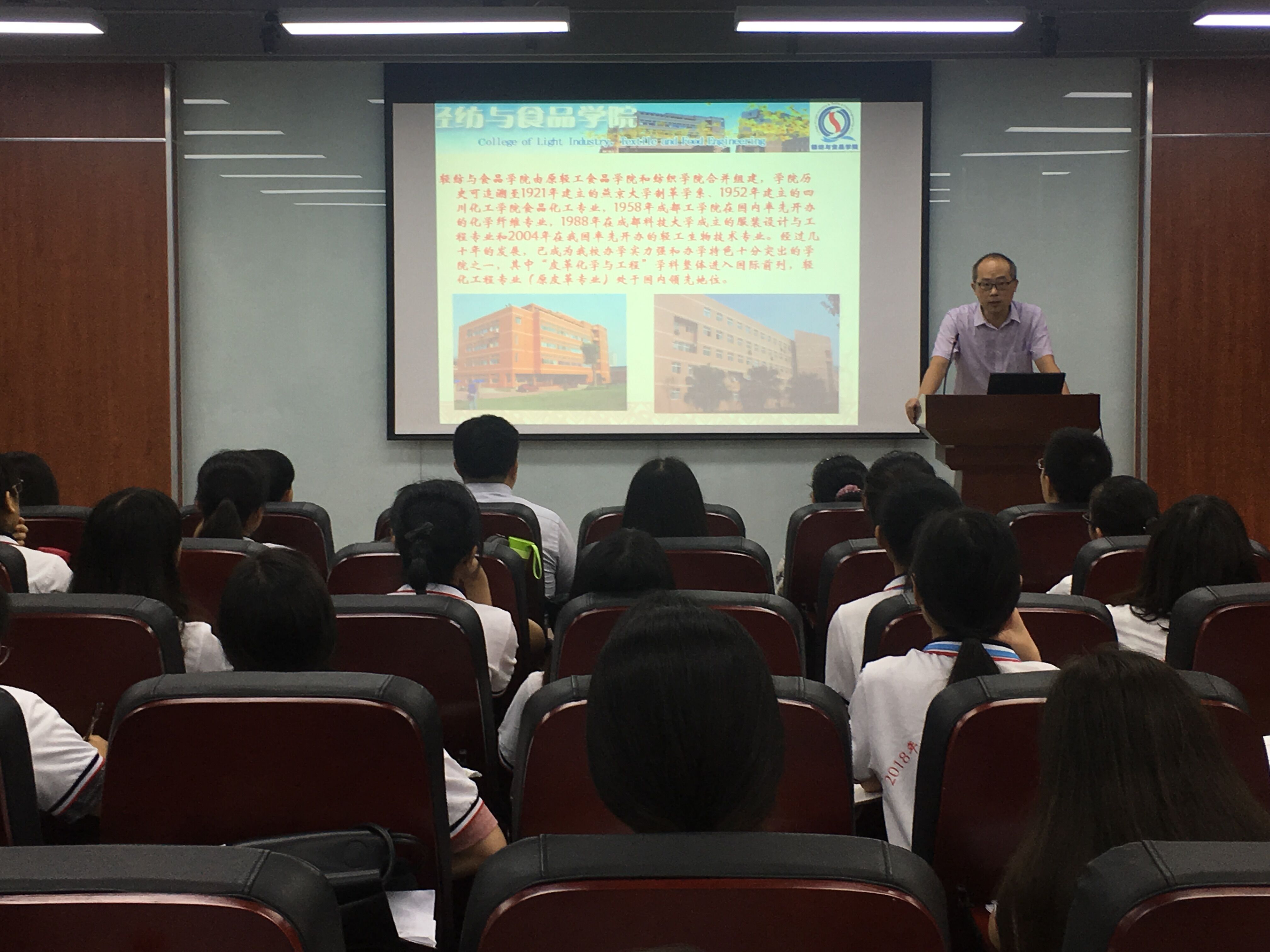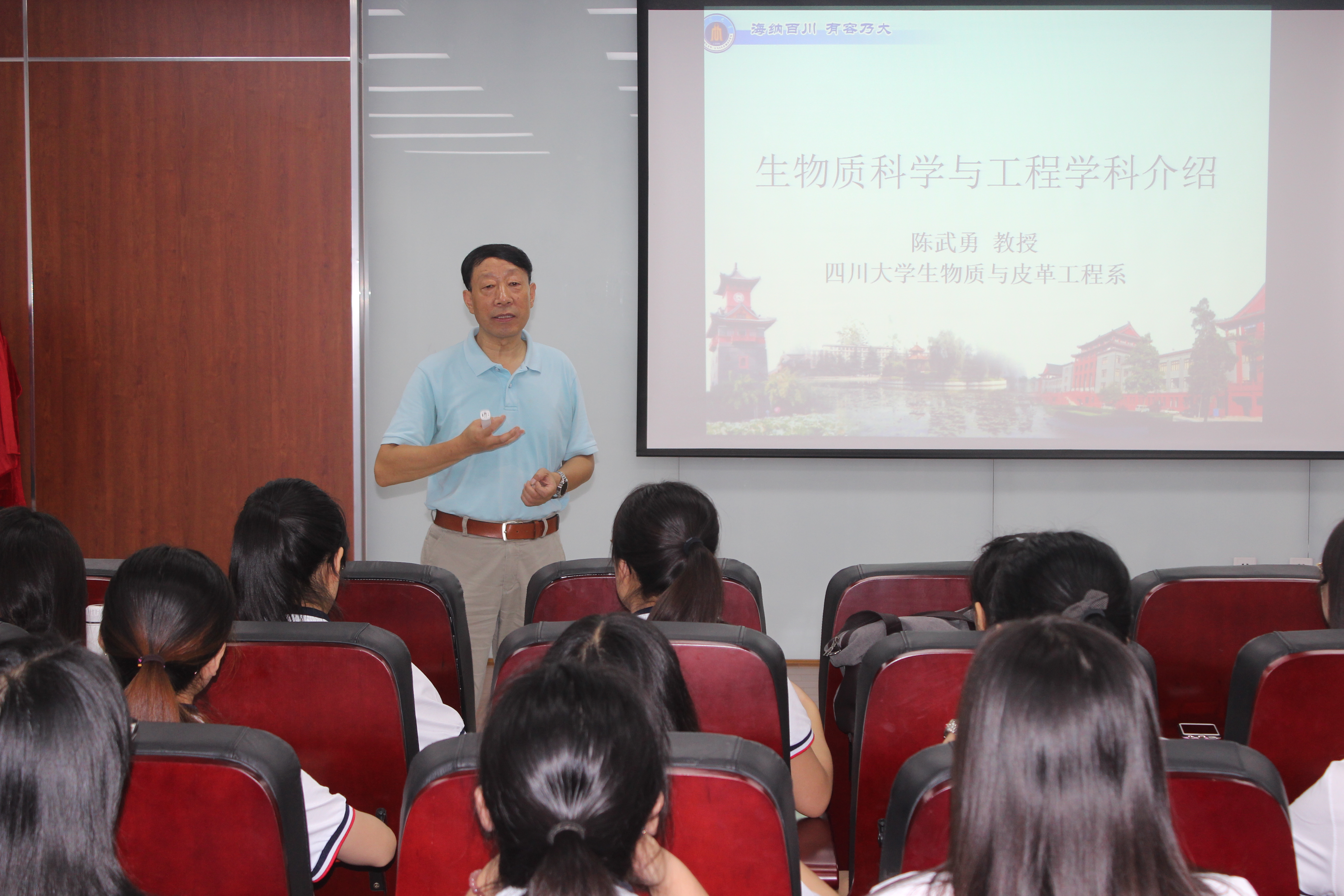 在开营仪式结束之后,举行了本次夏令营的首场专家报告。本次专家报告有幸邀请到国家级教学名师、生物质与皮革工程系博士生导师陈武勇教授。陈教授以生物质科学与工程学科介绍为主题,从国内外生物质相关专业大学及其特点出发,全面概述了生物质科学与工程专业的发展情况。并从什么是生物质、生物质转化技术与发展、生物质科学与工程学框架等方面进行了详解的介绍。并以传统食品、皮革、纺织等学科为例,阐述了传统轻工行业与生物质的关系。陈教授的报告让参会营员们对生物质学科有了全新的认识,并对同学们今后的学习研究指明了方向。