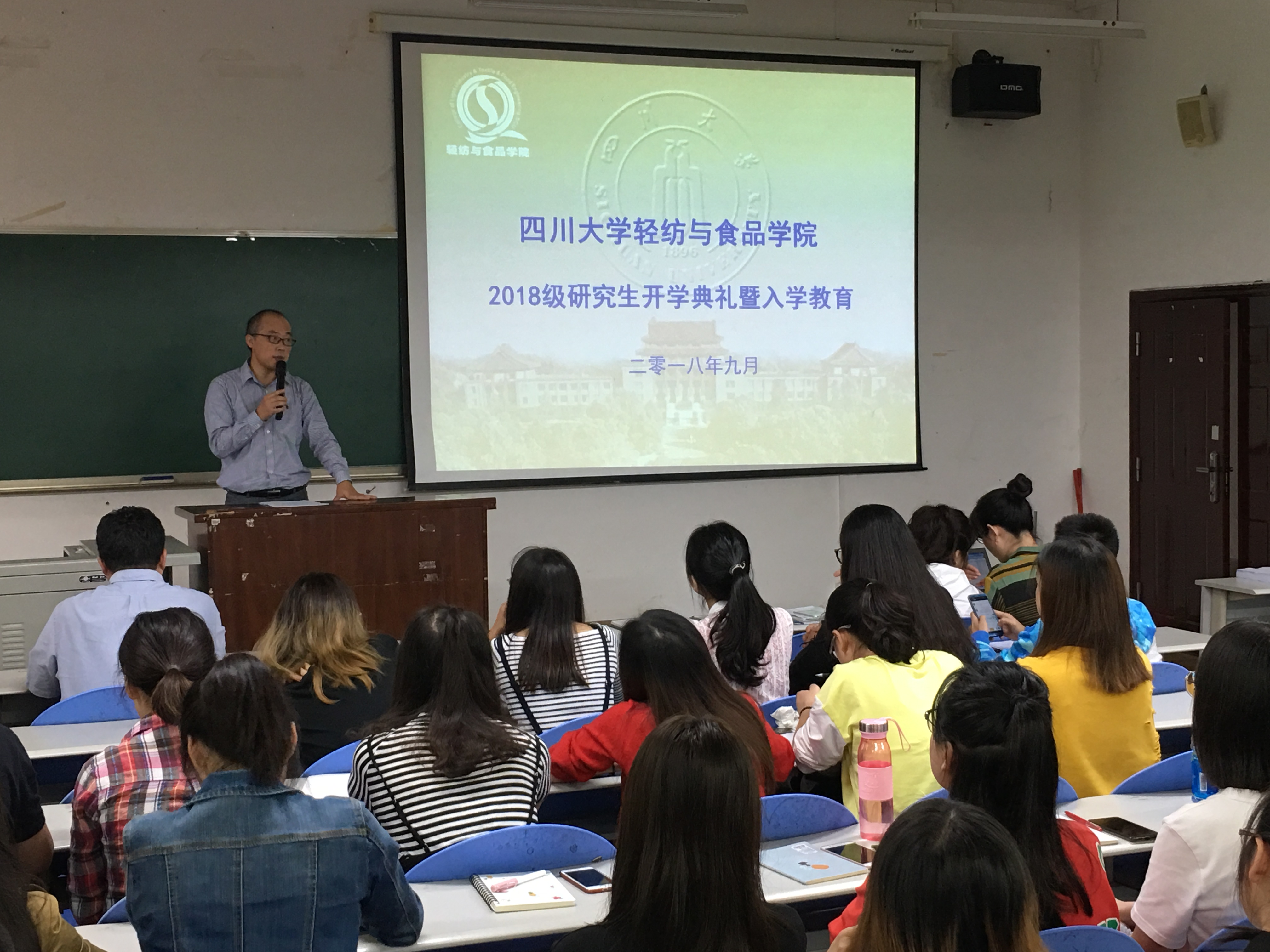 轻纺与食品学院2018级研究生开学典礼暨入学教育在纺工附楼205隆重举行。参加本次开学典礼的有学院党委书记刘晓虎副教授、院长何有节教授、副院长何强教授、生物质与皮革工程系副系主任杨璐铭副教授、纺织与服装工程系副系主任施亦东副教授、研究生教务员徐雅琳老师以及2018级全体研究生新同学。开学典礼由院党委副书记冯国涛老师主持。