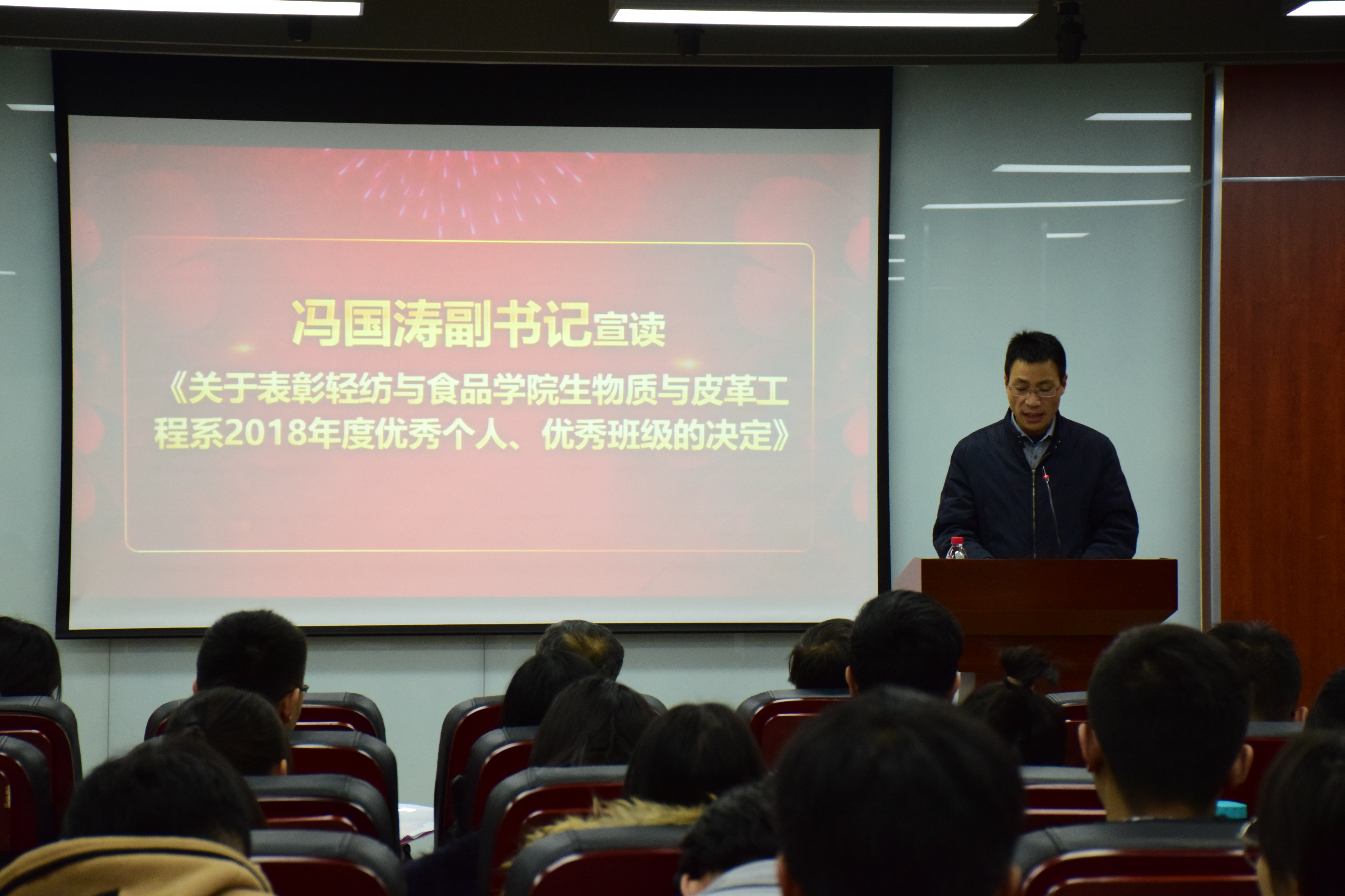随后,轻纺与食品学院党委副书记冯国涛老师宣读了�关于表彰轻纺与食品学院生物质与皮革工程系2018年度优秀个人、优秀班级的决定���隆重的颁奖音乐中,学院领导及与会嘉宾为获奖同学一一颁奖并合影留念�最后,获奖学生代表�2016级轻化工程专业李明辉同学发言,表达了对设奖单位的感谢,对学院生物质与皮革工程系长期的培养与教育表示谢意,并表示一定以此为新的起点,继续努力,取得更优异的成绩回报行业、社会以及学校�