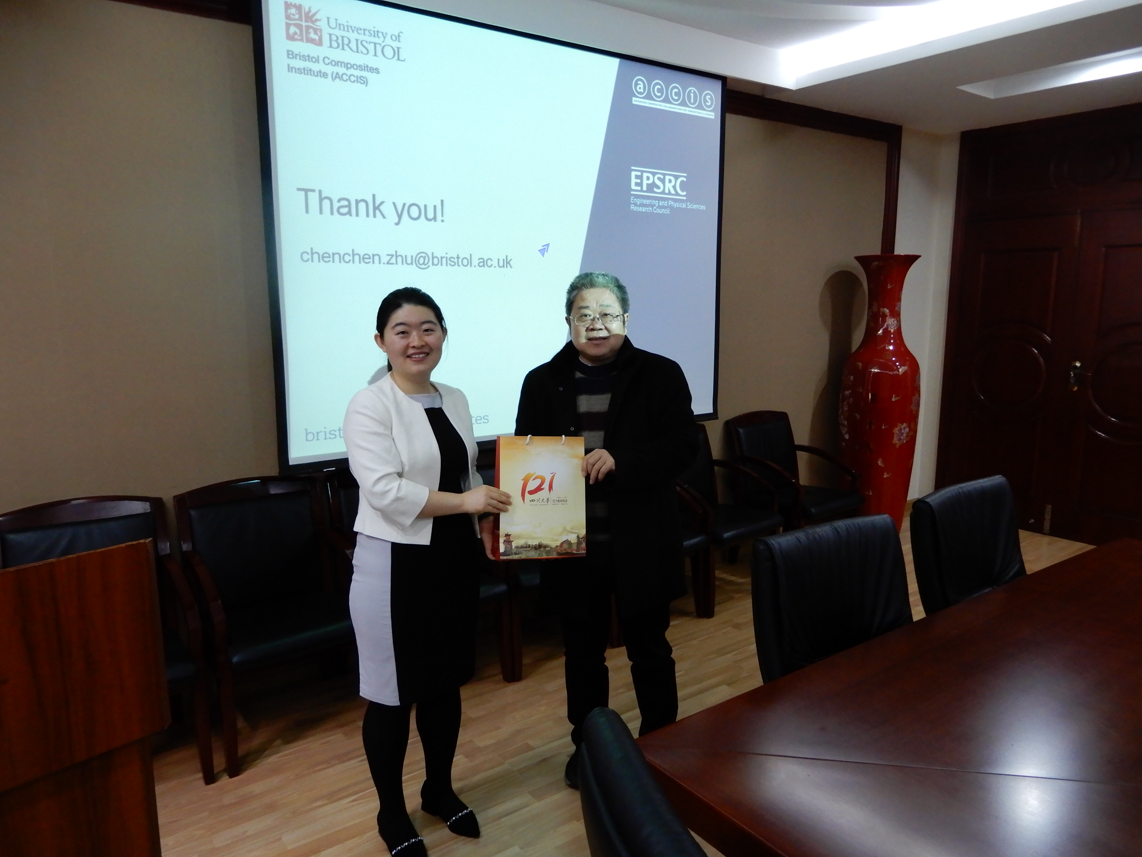 2019年2月26日上午,Dr. Zhu在皮革楼209室做了题为《Development of High-Performance Multifunctional Natural Polymer Fibbers and their Bio-based Sustainable Composites》的学术报告。Dr. Zhu首先简要介绍了布里斯托大学及复合材料研究所的概况,详细介绍了在开发环境友好、控制良好的制造工艺以及生产连续的天然聚合物纤维方面的研究成果:以天然高分子(如纤维素、几丁质)为原料,采用离子液体作为溶剂,取代传统的危险溶剂溶解天然高分子材料,在有/无共同溶剂的条件下,生产高性能和可持续纤维,以取代玻璃纤维,作为增强生物复合材料并替代碳纤维。来自皮革系、高分子研究所、纺织系的师生参加了本次学术活动,报告会上双方进行了热烈的交流与互动。最后,但卫华教授向Dr. Zhu赠送纪念品并祝贺学术报告会圆满成功。