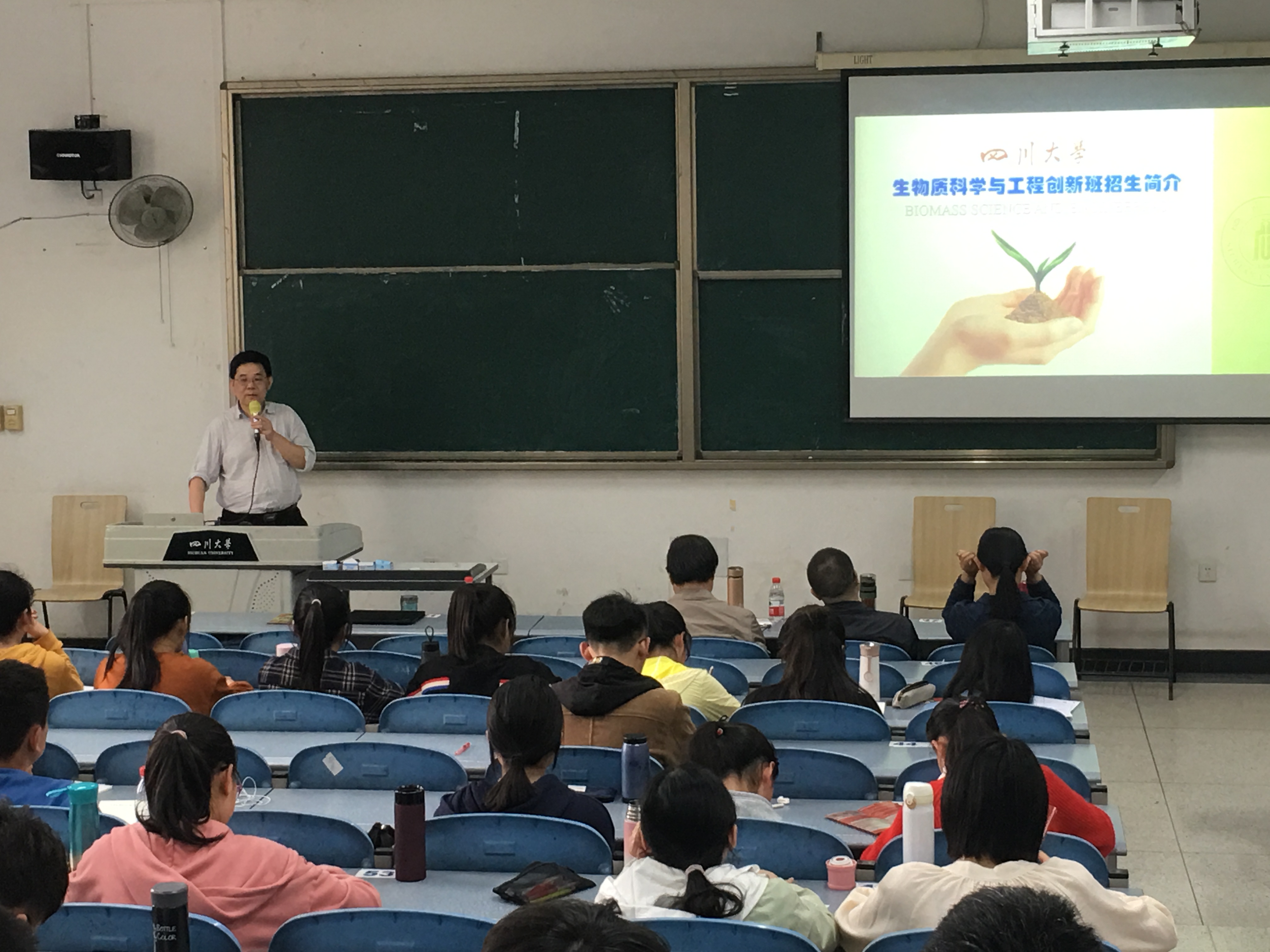 宣讲会开始后,彭必雨副院长首先对创新班的开办背景、师资力量、培养目标及特色、学生发展及就业方向、激励政策及保障、选拔方案及流程进行了全面介绍。彭院长重点介绍了创新班的培养模式,创新班特别重视学生的科研能力培养,采用宽基础知识交叉培养模式。学生在大一暑假、大二学年、大二暑假三个时间段可分别在生物质材料、生物质能源、生物质化学品、生物质转化和生物质基础科学问题研究五个平台开展轮转式科研基本技能训练,在大三上学学期进入指导老师课题组或创新班依托平台开展科研实践。同时,创新班将在两个优势学院、三个国家级科研平台上,为学生提供科研平台保障。并在此平台上由石碧院士、王玉忠院士、王琪院士牵头的优秀师资团队中进行科研探索与实践,切实提高学生的科研创新能力与水平。随后,冯国涛副书记补充介绍了创新班的奖学金激励政策、研究生奖学金政策以及创新班的动态管理政策等。