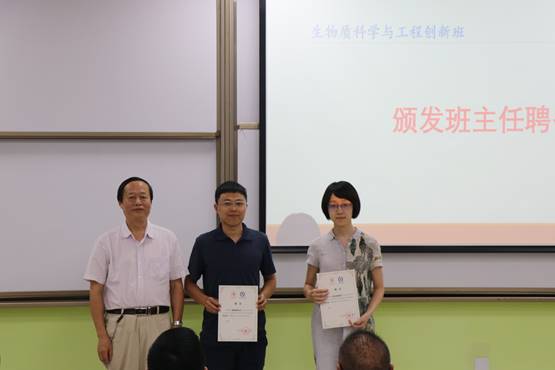 关于生物质科学与工程创新班平台负责人、课程负责人、名誉班主任和班主任的聘任决定》,刘晓虎书记向相关负责人颁发聘书,并表示聘书颁发后,老师们将责任重大、使命光荣,希望各位老师以高度的责任感与使命感,共同努力,携手规划好、建设好创新班的各项工作。