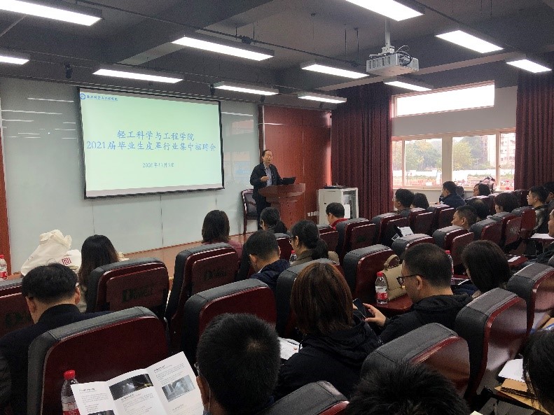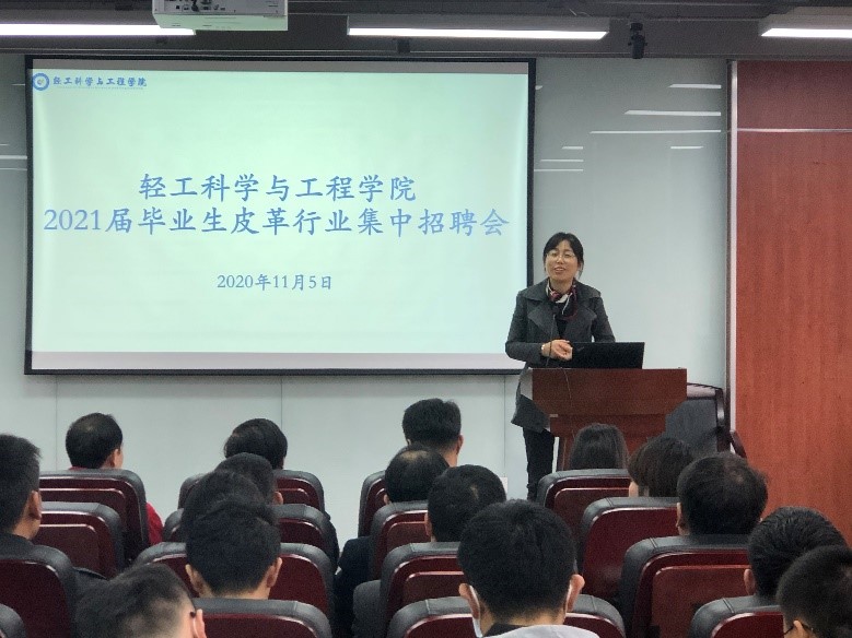 接着,院长何有节教授代表学院感谢与会企业的到来,指出当前皮革行业急需高学历人才的现状,并对企业及学生提出美好祝愿。生物质与皮革工程系主任林炜教授代表全系师生欢迎企业参加本次招聘会,介绍了学院与企业共同合作培养学生所取得的一系列成果,表明学院一直坚持以解决问题为导向培养学生,同时希望2021届毕业生能为企业做出贡献。