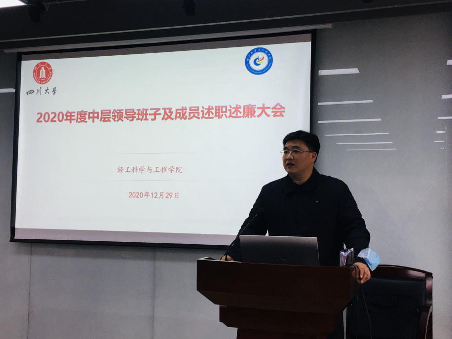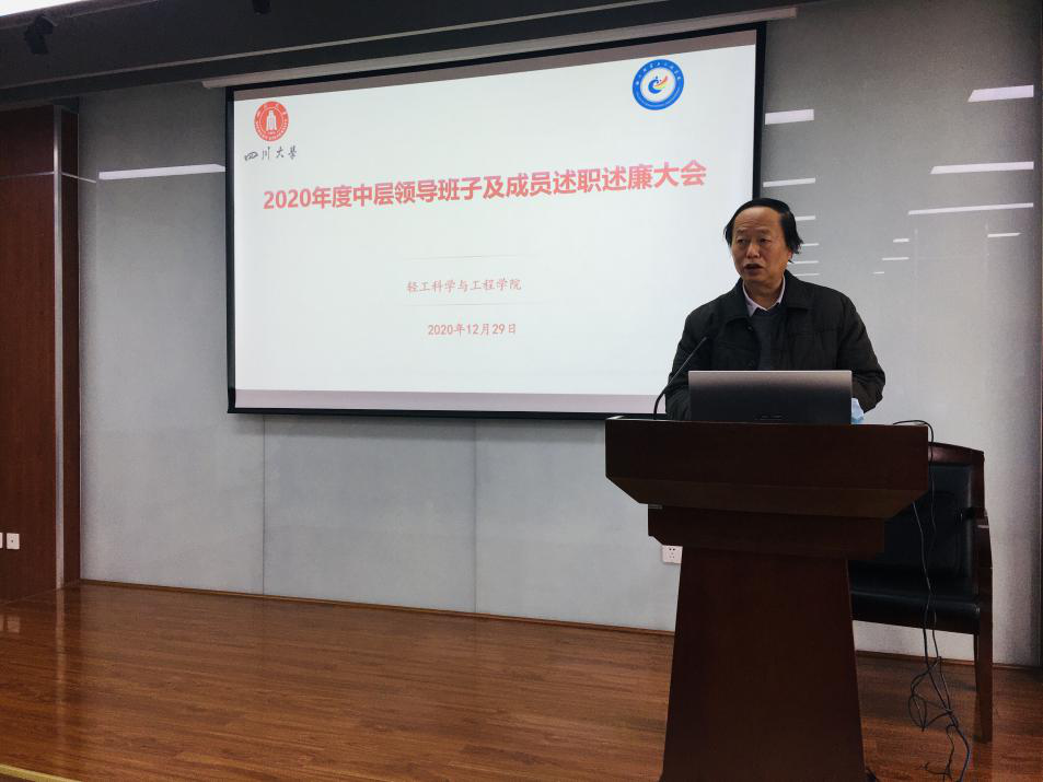 2020�12�9��午,轻工科学与工程学院在皮革�215报告厅,召开学院领导班子及成�2020年度述职述廉暨民�测评大会。大会由学院党委书记刘晓虎主持,全院教职员工参会�