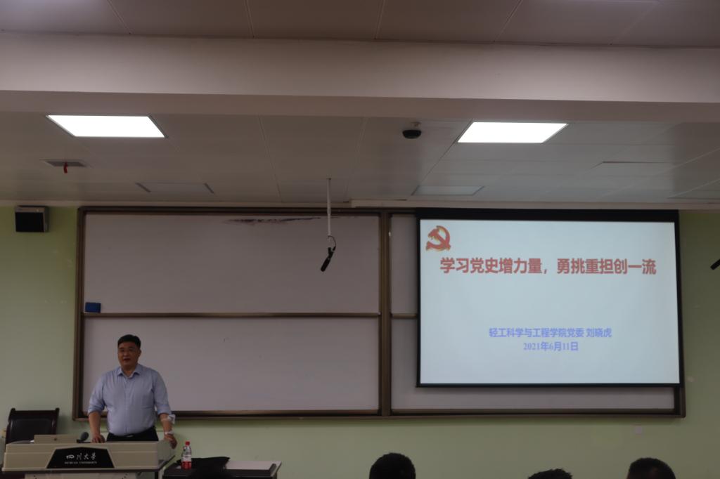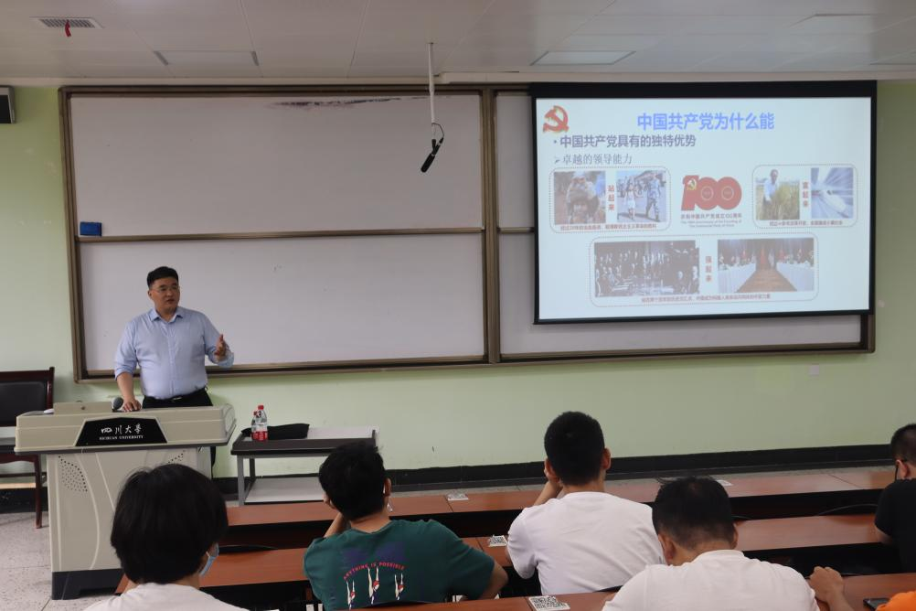 江安校区第一教学楼B103教室为2020级本科生作党史学习教育专题辅导报告。本次辅导报告由2020级辅导员余昕玲老师主持。刘晓虎书记以“学习党史增力量,勇挑重担创一流”为主题,从“中国共产党为什么能”、“马克思主义为什么行”、“中国特色社会主义为什么好”、“学习党史应该获得的力量”四个部分进行重点讲授。