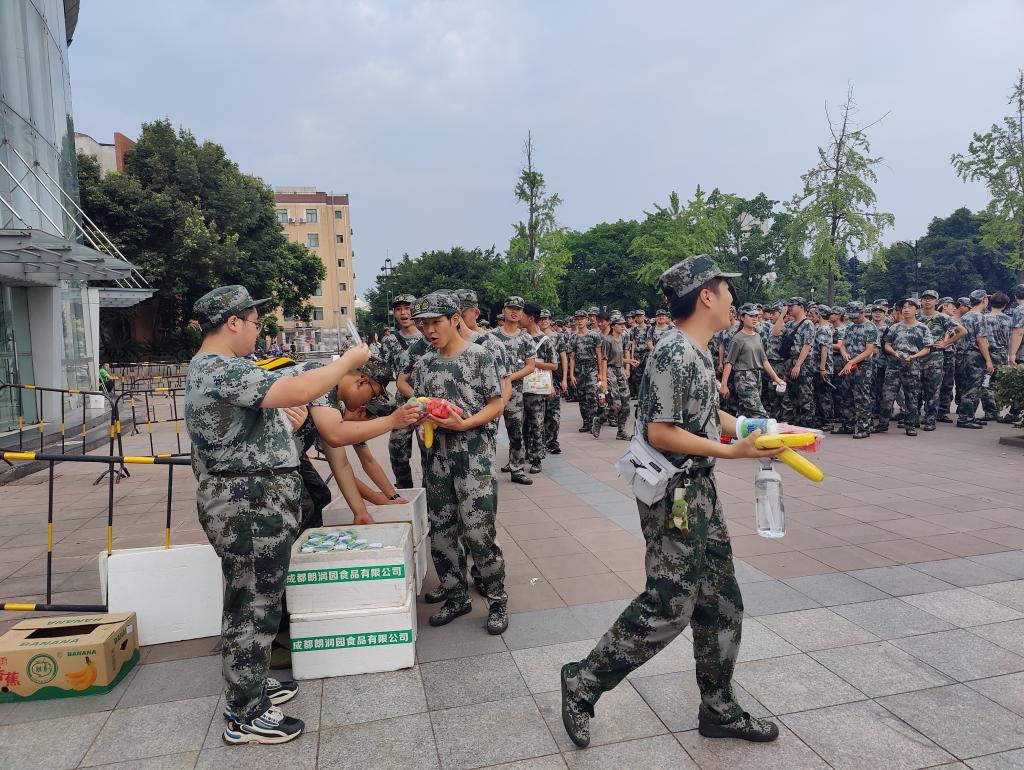 本次慰问中,学院领导不仅给予了同学们精神上的鼓励和支持,也为全体参训学生带来了水果、饮料等慰问品。辅导员贺婷老师、余昕玲老师以及各连队教官共同组织完成分发工作,收到慰问品的同学们在欢欣雀跃之余,也不忘对领导老师们表达感谢之情。