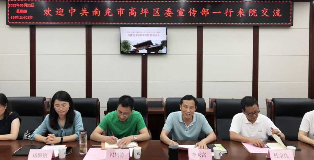 首先,李天富书记对中共南充市高坪区委宣传部一行的到访表示热烈欢迎,并介绍了学院的基本情况、系所设置和专业特色。其次,学院纺织研究所所长杜宗良教授、服装与服饰设计系主任杨璐铭教授分别从科学研究、人才培养、学科建设等方面进行了介绍。