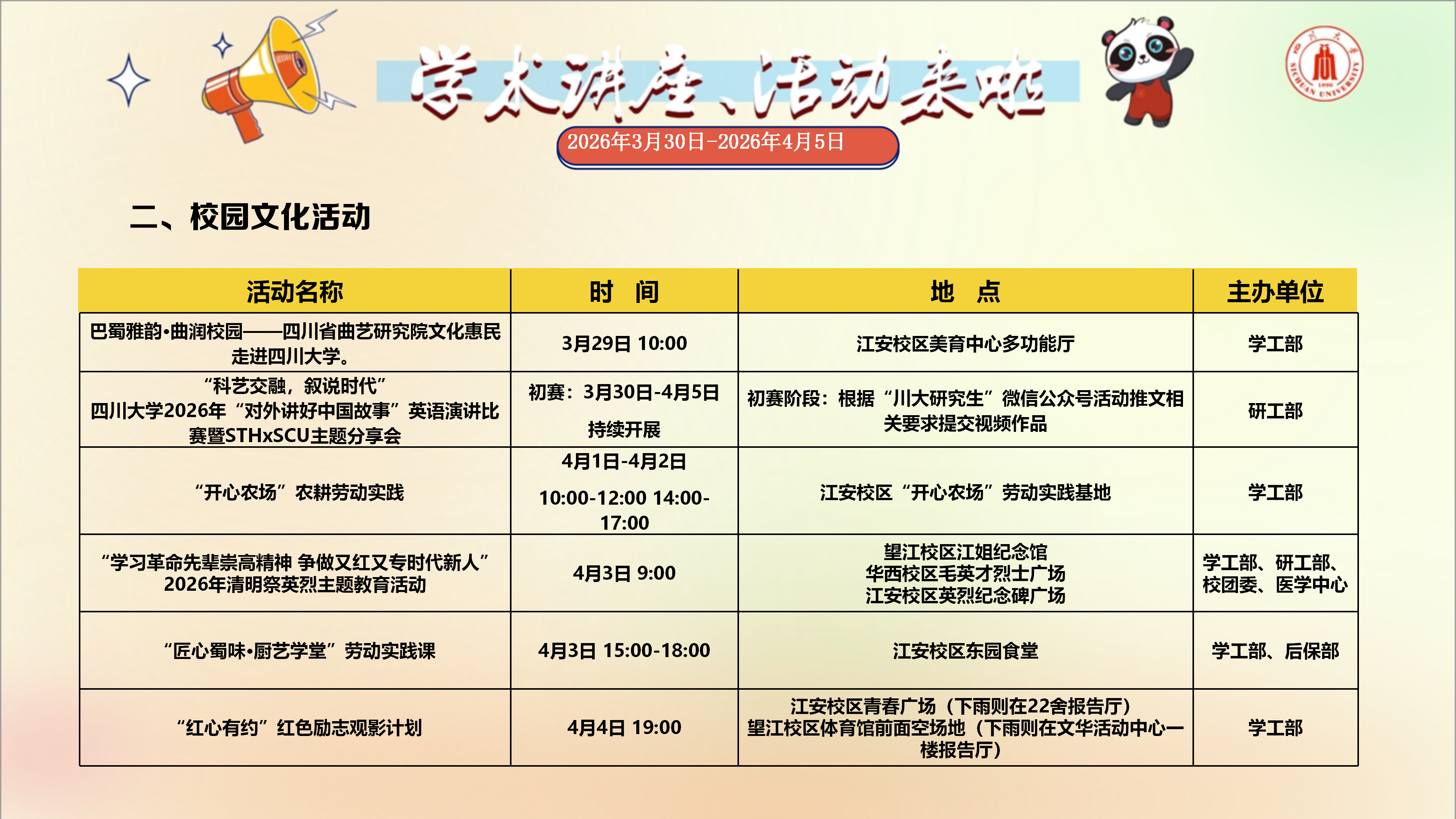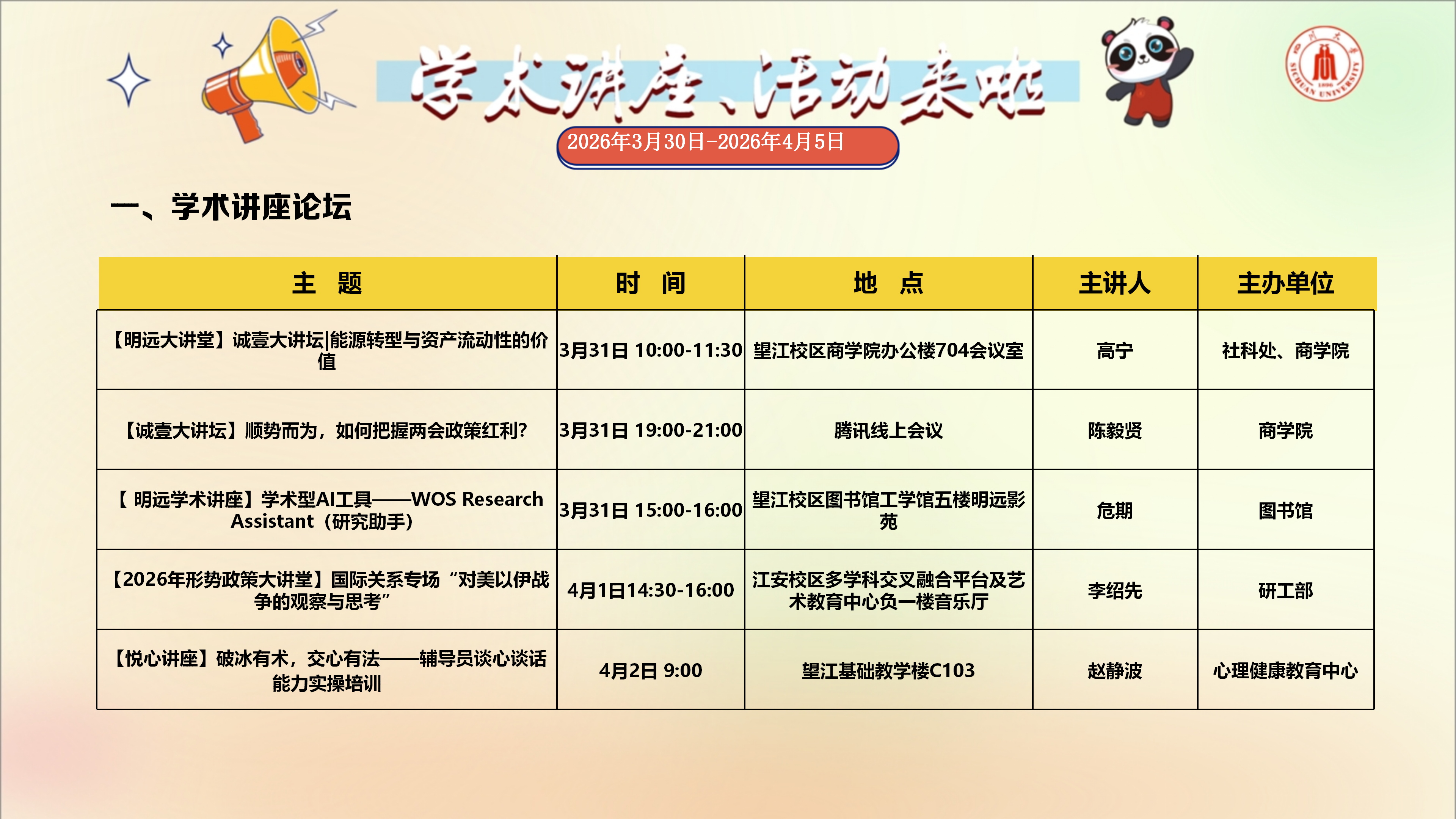 学术讲座与校园文化活动预告(2026年3月30日-2026年4月5日)