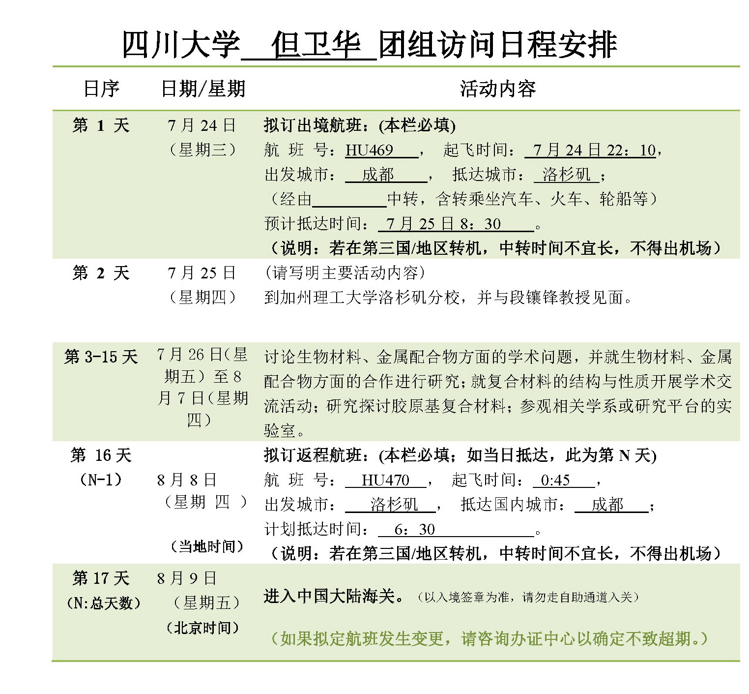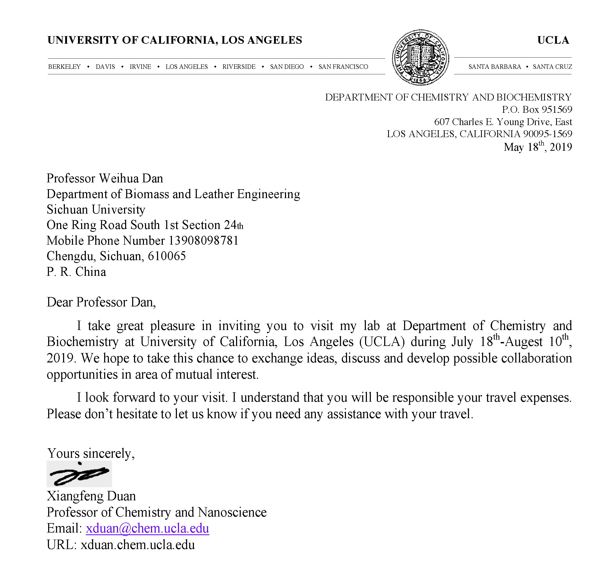 应加州理工大学洛杉矶分校的邀请,但卫华教授将于2019年7月24日-8月9日赴美国(日程18天,增加邀请函及在外行程单公示),参加学术交流活动,经费来源为科研经费,往返路线为:成都-北京-洛杉矶-北京-成都。
