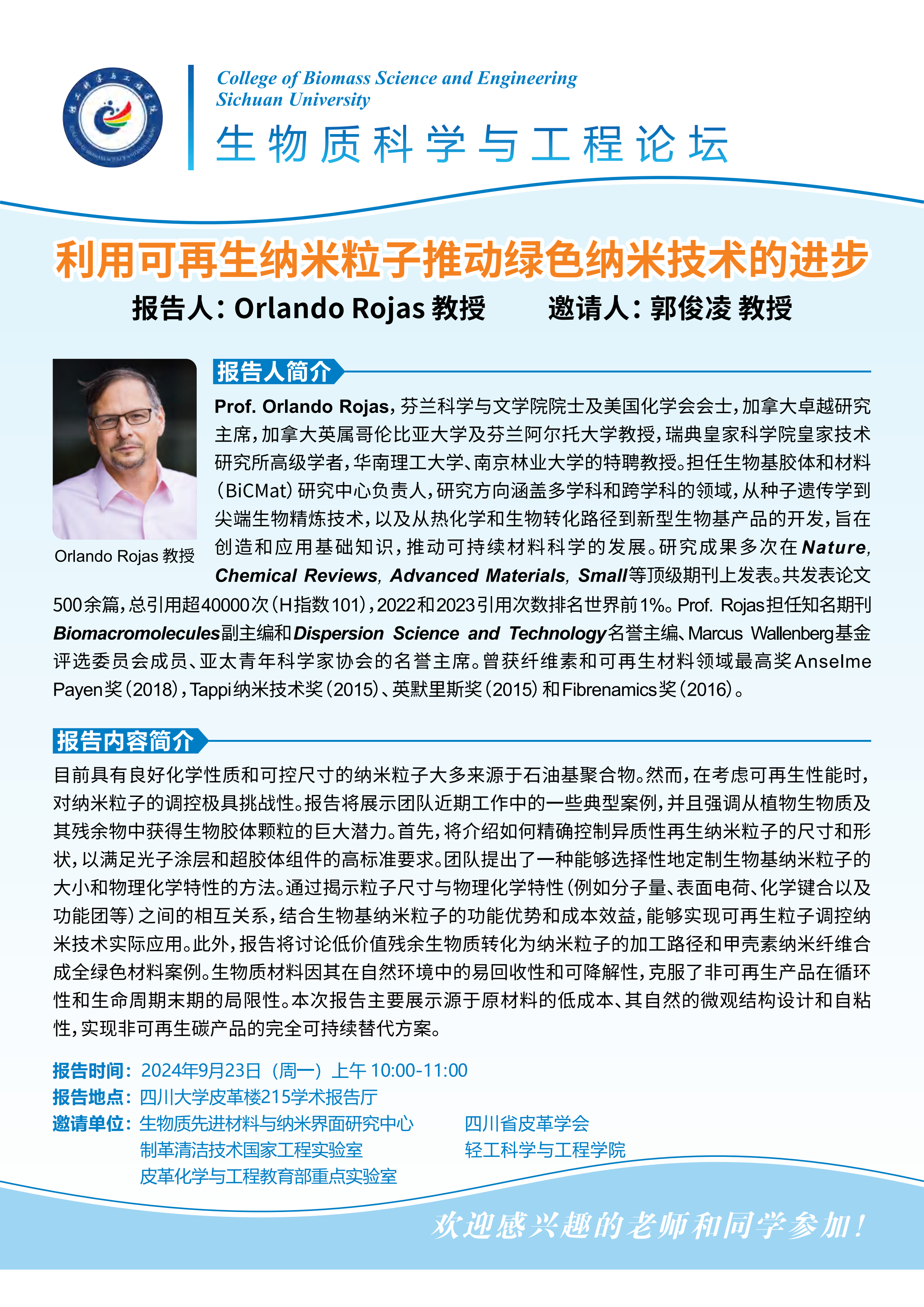 生物质科学与工程论坛:Orlando Rojas教授 学术报告