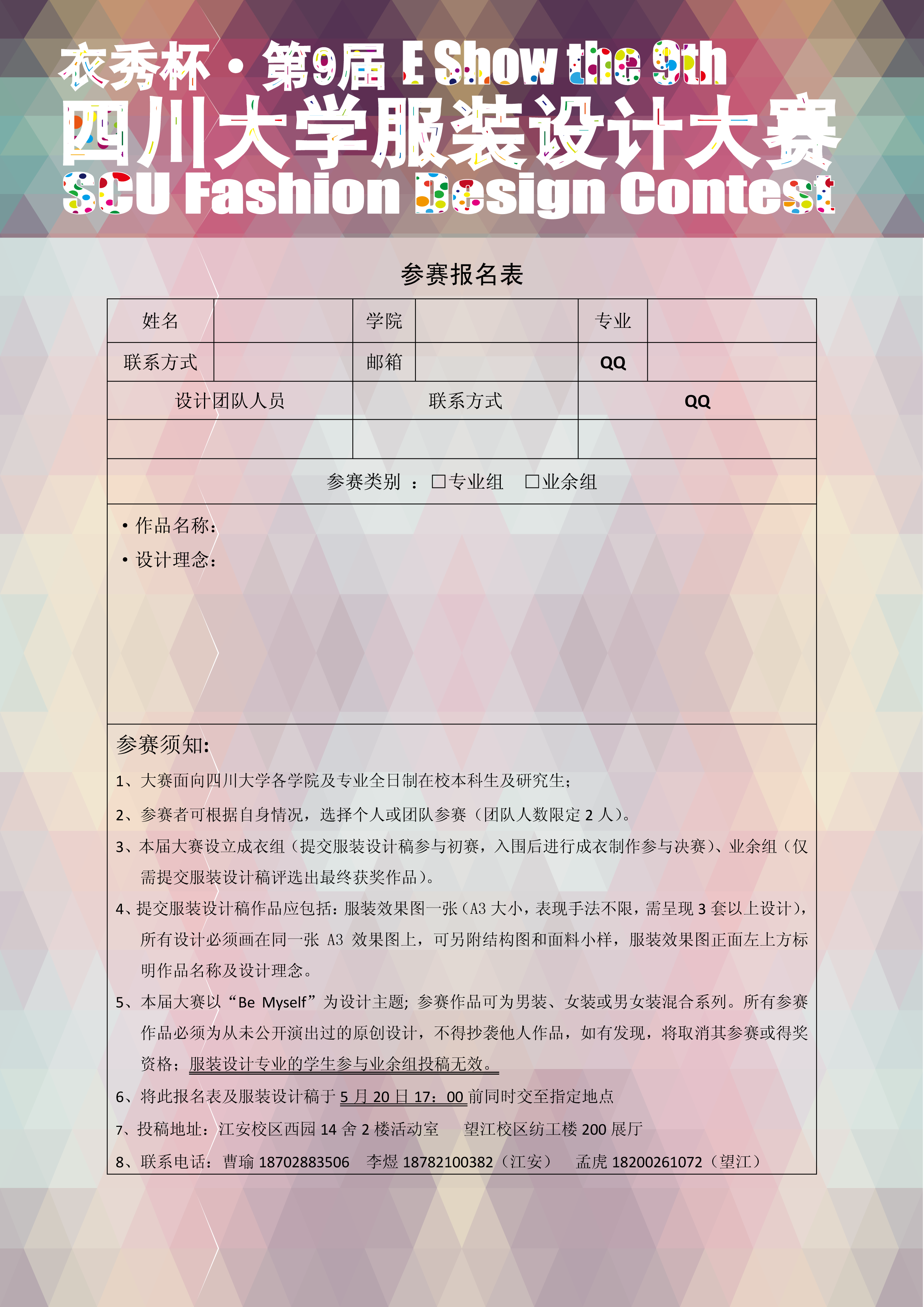 业余组一等奖1名(奖金+校级证书)二等奖2名(奖金+校级证书)三等奖3名(奖金+校级证书)九、联络方式投稿地址:江安校区西园14舍2楼活动室 望江校区纺工楼200展厅(5月20日17::00截稿)联系电话:曹瑜18702883506 李煜18782100382(江安) 孟虎18200261072(望江)电子邮箱:[email protected]微信公共主页:轻纺团委学生会 人人网公共主页@衣秀杯服装设计大赛 第九届衣秀杯服装设计大赛报名表.png 羞羞漫画