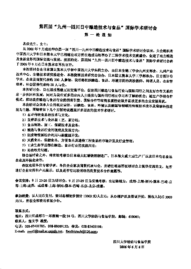 九州——四川 第四届日中酿造技术与食品国际学术研讨会(筹备意见) 会议主题:酿造、食品、环境及能源领域的技术、学术交流与合作召开日期:2006年9月24-30日举办地点:日本熊本 主办:日本国立熊本大学、中国羞羞漫画