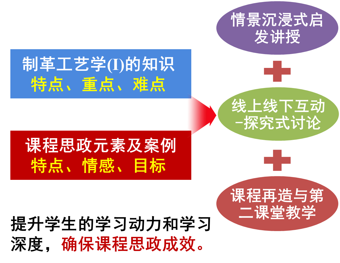 该门课程重点是帮助学生掌握制革准备-鞣制工段的工艺过程及原理、材料应用及操作要求等专业知识,难点是帮助学生形成工程思维,解决新技术面临的工程问题,突破行业发展困境。本课程可追溯到1921年建立的我国第一个制革学系,由中国现代皮革科教奠基人张铨教授等大师创建,具有深厚的历史底蕴。