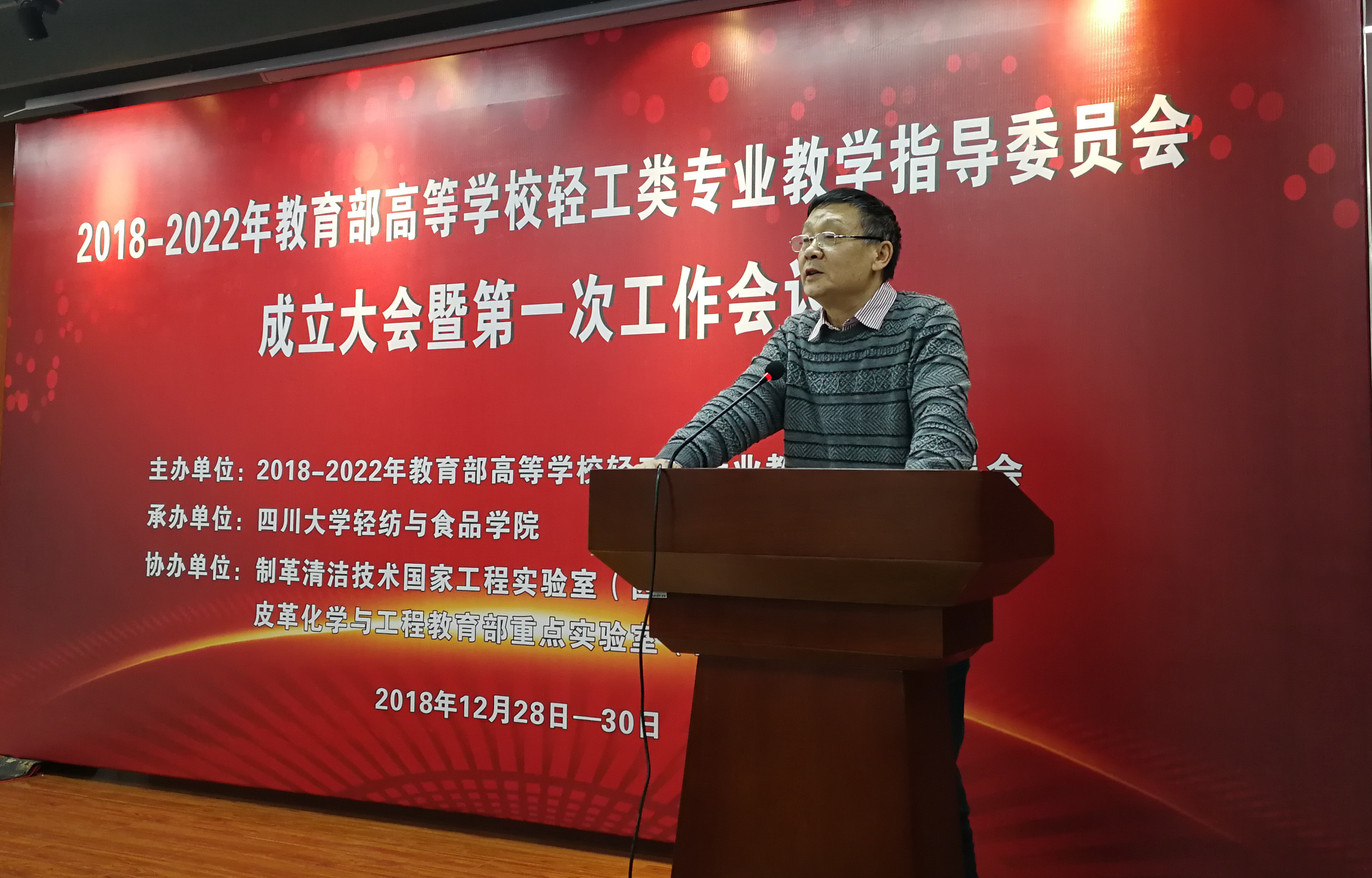 为全面贯彻落实全国教育大会精神、新时代全国高等学校本科教育工作会议和教育部2018-2022年高等学校教学指导委员会成立会议精神,研讨筹划轻工类教指委工作,2018�12�28日至30日,由“教育部高等学校轻工类专业教学指导委员会”主办,四川大学轻纺与食品学院承办,制革清洁技术国家工程实验室和皮革化学与工程教育部重点实验室协办,�2018-2022年教育部高等学校轻工类专业教学指导委员会(以下简称“轻工类教指委”)成立大会暨第一次工作会议”在四川大学(四川成都)隆重召开�