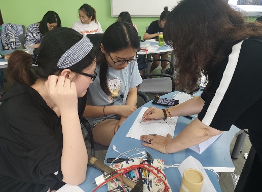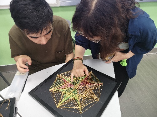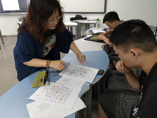 课堂上,周爱华老师结合蜀绣衣锦纹针法,并以《中国非遗蜀绣衣锦纹针法图谱》中的图案为例,详细阐述了如何从“非遗”蜀绣衣锦纹针法中的“格子”出发,通过创新设计形成具有一定韵律的图案从而达到出演“格韵”的课程内容。吴玉英女士讲解了蜀绣衣锦纹针法的历史及特点,并现场演示了蜀绣衣锦纹的刺绣针法,同学们对所学内容表现出了极大的兴趣,纷纷体验了衣锦纹针法的刺绣过程。在一周的时间内,同学们完成了绕线画的个人创作以及蜀绣衣锦纹针法图谱的A3平面创新设计。