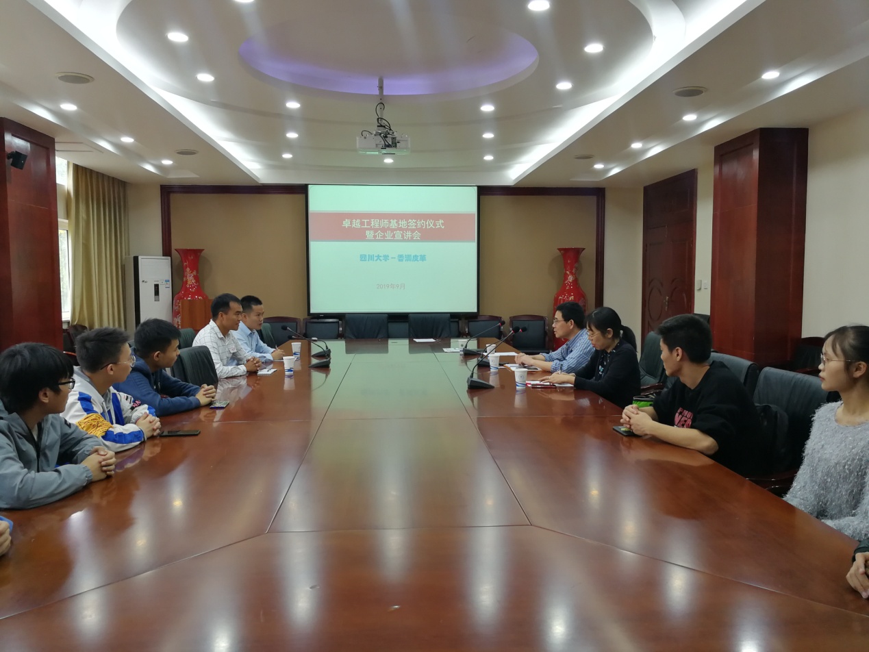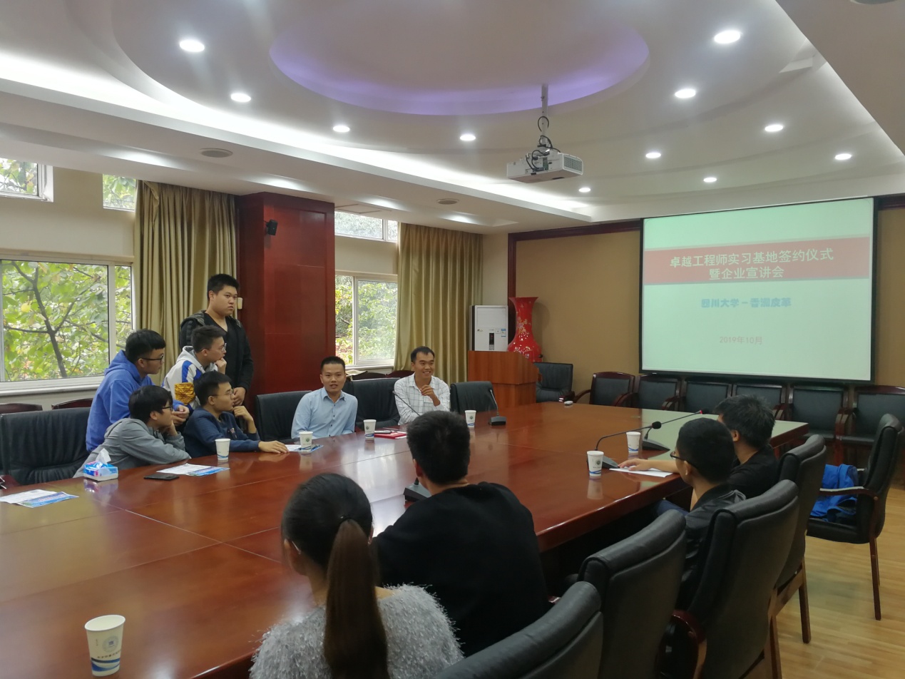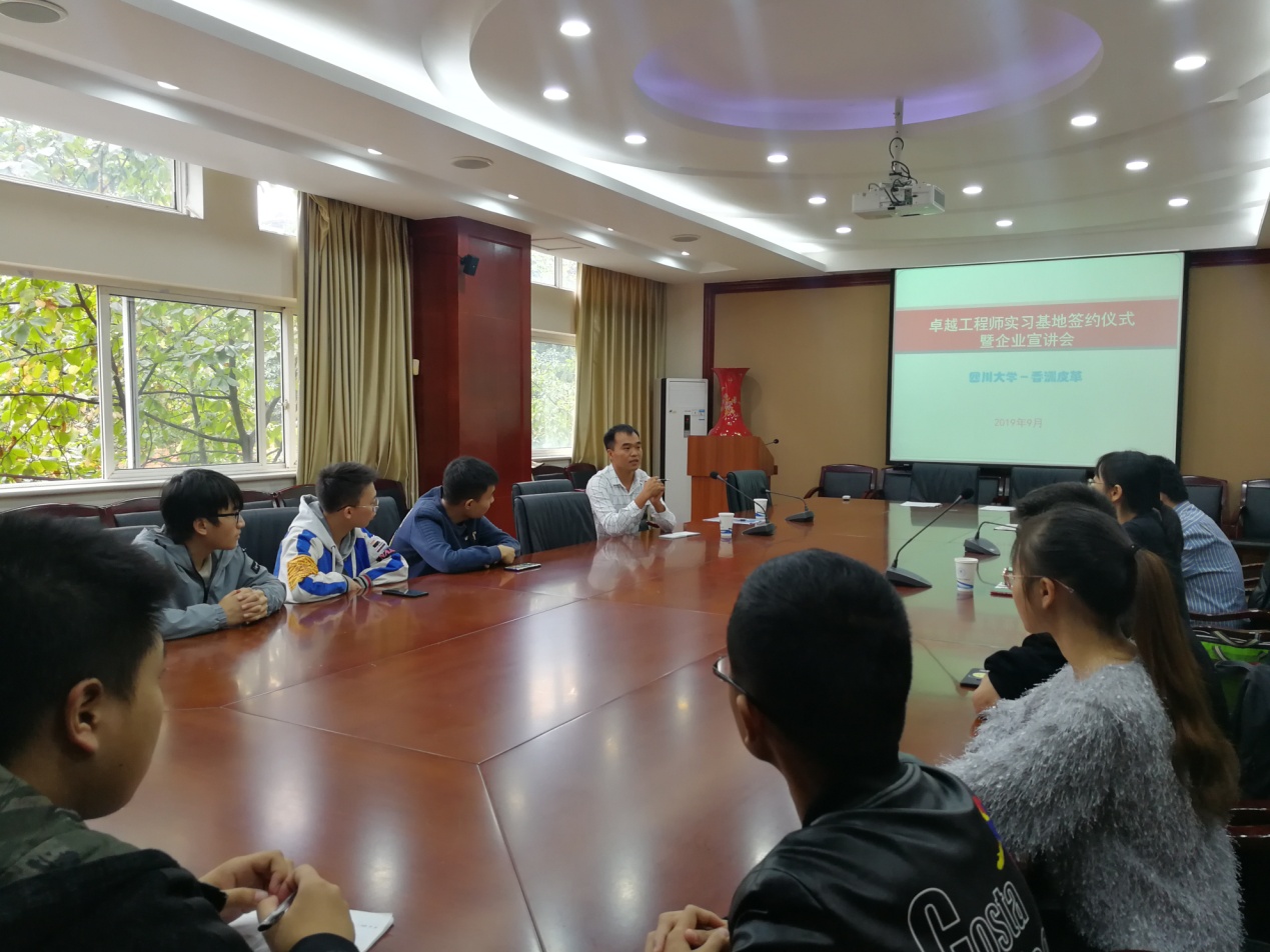 2019�10�14日下�2:30,四川大学轻工科学与工程学院与漳洲香洲皮革有限公司“共建卓越工程师实习基地签字仪式暨企业宣讲会� 在皮革楼209会议室顺利举行。四川大学轻工科学与工程学院副院长彭必雨教授、生物质与皮革工程系系主任林炜教授、皮革工程教研室主任但年华副教授、漳洲香洲皮革有限公司执行副总林汉彬、人力行政部傅国润经理及2016级本科生出席了本次会议�