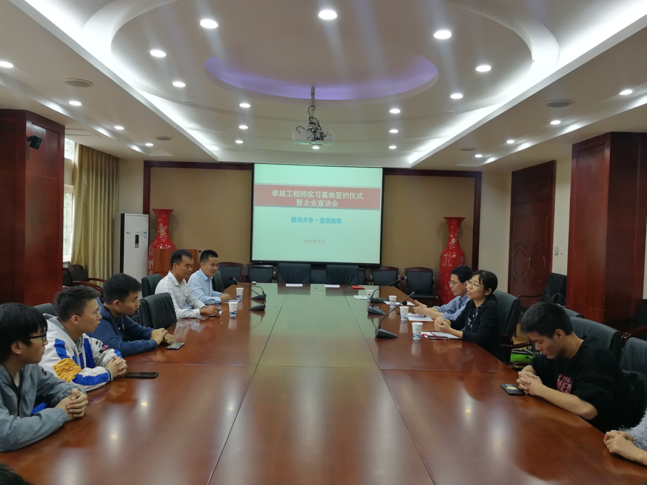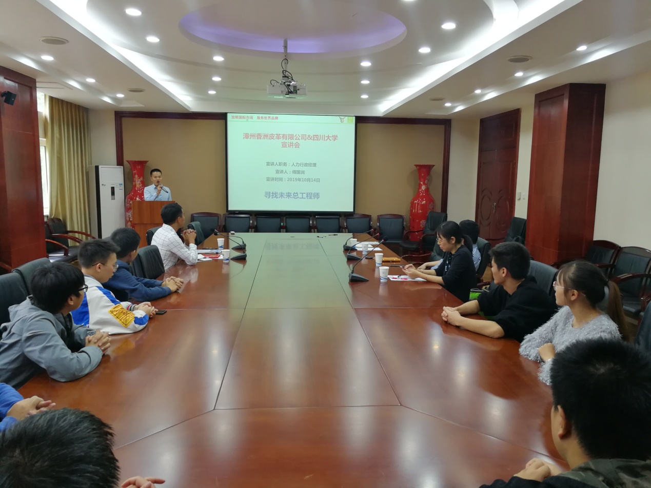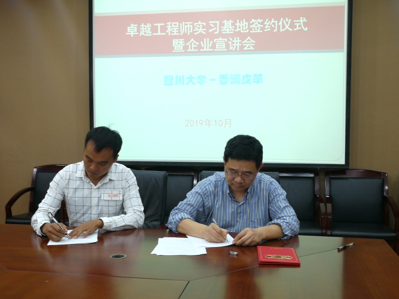 2019�10�14日下�2:30,四川大学轻工科学与工程学院与漳洲香洲皮革有限公司“共建卓越工程师实习基地签字仪式暨企业宣讲会� 在皮革楼209会议室顺利举行。四川大学轻工科学与工程学院副院长彭必雨教授、生物质与皮革工程系系主任林炜教授、皮革工程教研室主任但年华副教授、漳洲香洲皮革有限公司执行副总林汉彬、人力行政部傅国润经理及2016级本科生出席了本次会议�