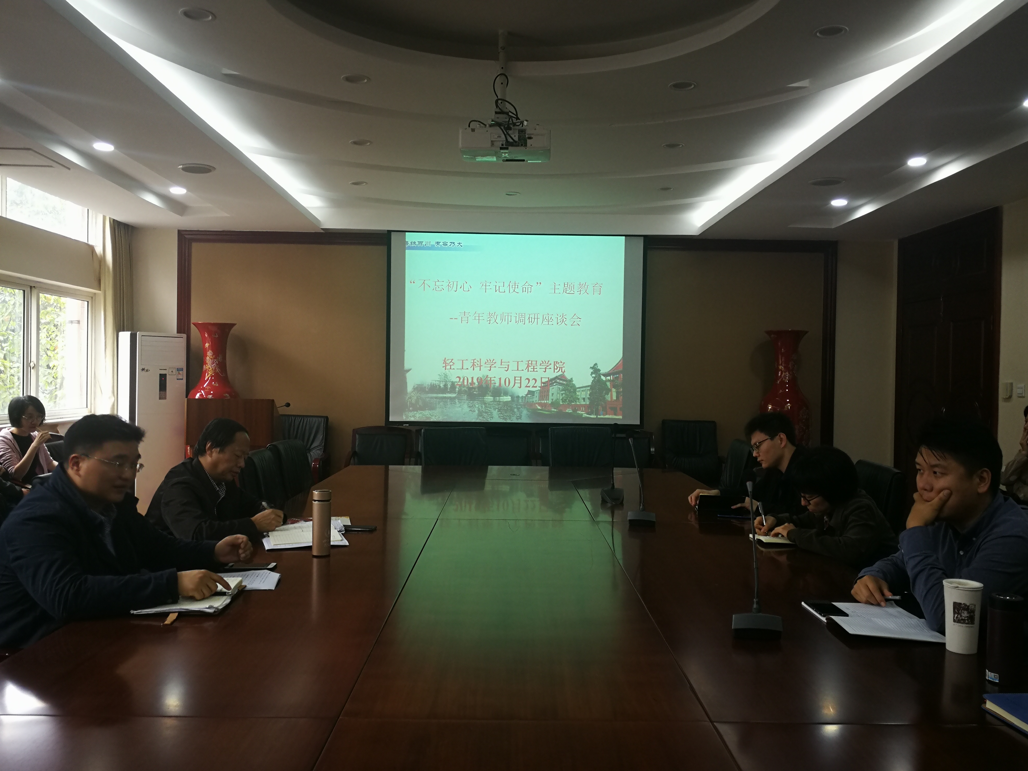 在皮革楼209会议室,召开“不忘初心、牢记使命”主题教育青年教师调研座谈会,党政主要负责人参加本次调研,深入基层认真听取青年教师的意见和建议。