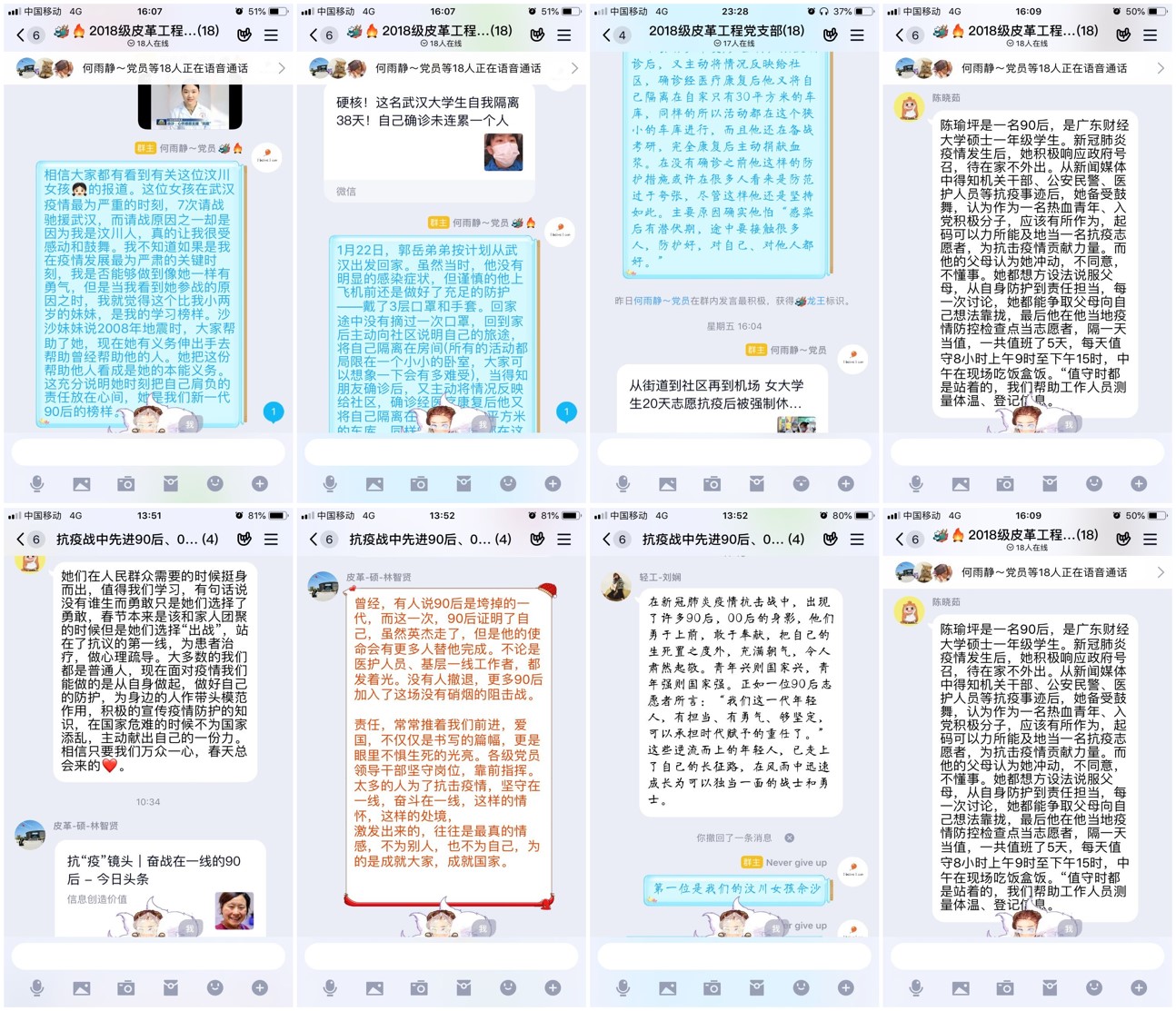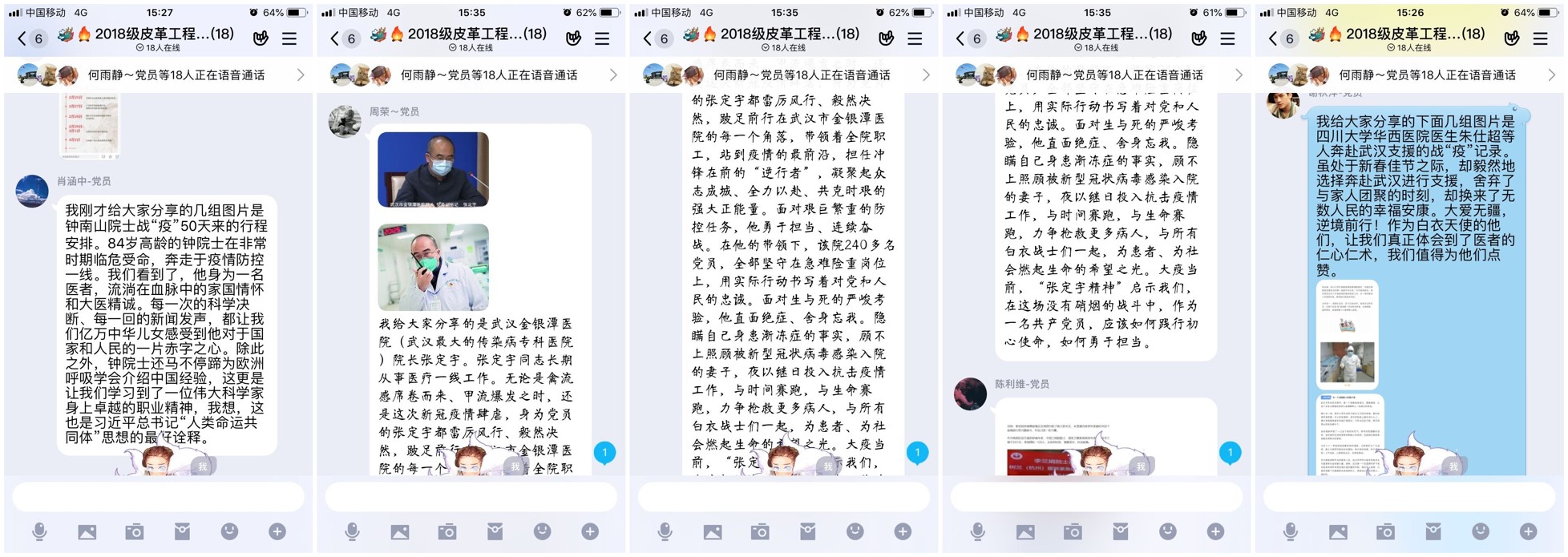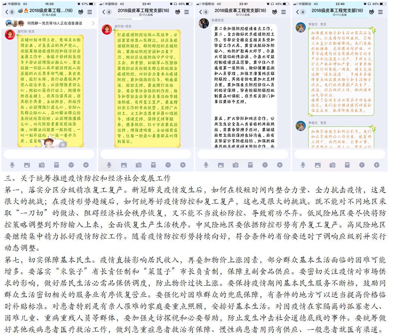 2020313日下午三点,2018级皮革硕士研究生党支部结合习近平总书记在疫情期间的讲话精神和奔赴前线的先锋模范代表事迹,召开了“同心抗疫,‘疫’路学习”云上主题党日活动,会议由支部书记何雨静同志主持,全体党员通过线上语音和文字交流方式参加�