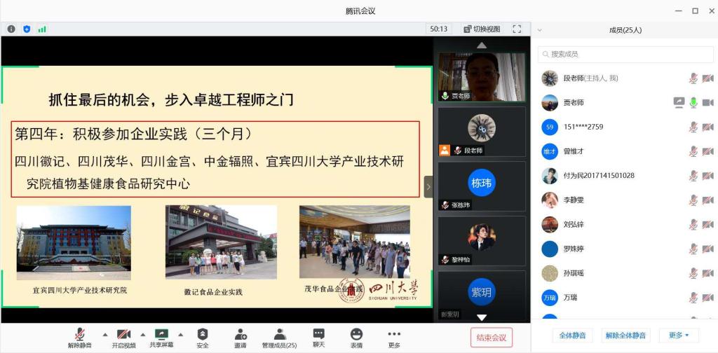 食品科学与工程专业通过腾讯会议平台,成功举办“卓越工程师班”(省级)选拔的线上宣讲会。会议由食品科学与工程专业教研室主任段飞霞老师主持,参加会议的有食品工程系副系主任曾维才副教授和卓工班企业实践课程的负责人贾利蓉教授以及2017级食品专业的全体同学。
