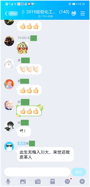 本次在线会议,同学们受益良多。不少同学发出“入学这么久,没想到我们轻化工程这么强!”、“原来我们皮革系还提铀啊?!”、“师兄师姐们这么优秀,我也希望能像他们一样”的感叹。