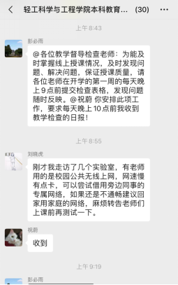 按照既定的督导工作安排,全体院系领导、督导组成员提前进入课程群,对教师线上教学的准备工作、学生到课率、授课质量、教学秩序等方面进行了认真检查,发现问题,协助解决问题,及时将检查情况报送学陀学院每天晚�10点前整理好当日查课情况总结,反馈给相关部门和人员�