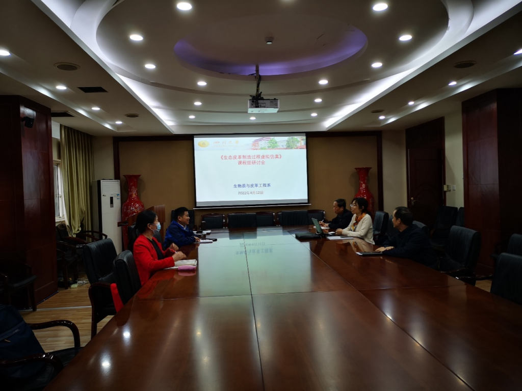 为了加快深化工程教育改革、建设“新工科”,促进“四新”建设背景下人才培养质量的提升,轻化工程教研室在院系的领导下,积极开展在教育信息化、数字化改革下的教研教改工作。2022年4月12日,《生态皮革制造过程虚拟仿真》课程组在皮革楼209会议室召开教学研讨会,学院组织员(原学院院长)何有节教授、生物质与皮革工程系系主任林炜教授(课程负责教师)、副系主任程海明教授、教研室主任但年华副教授(任课教师)和王春华副教授参加了会议。