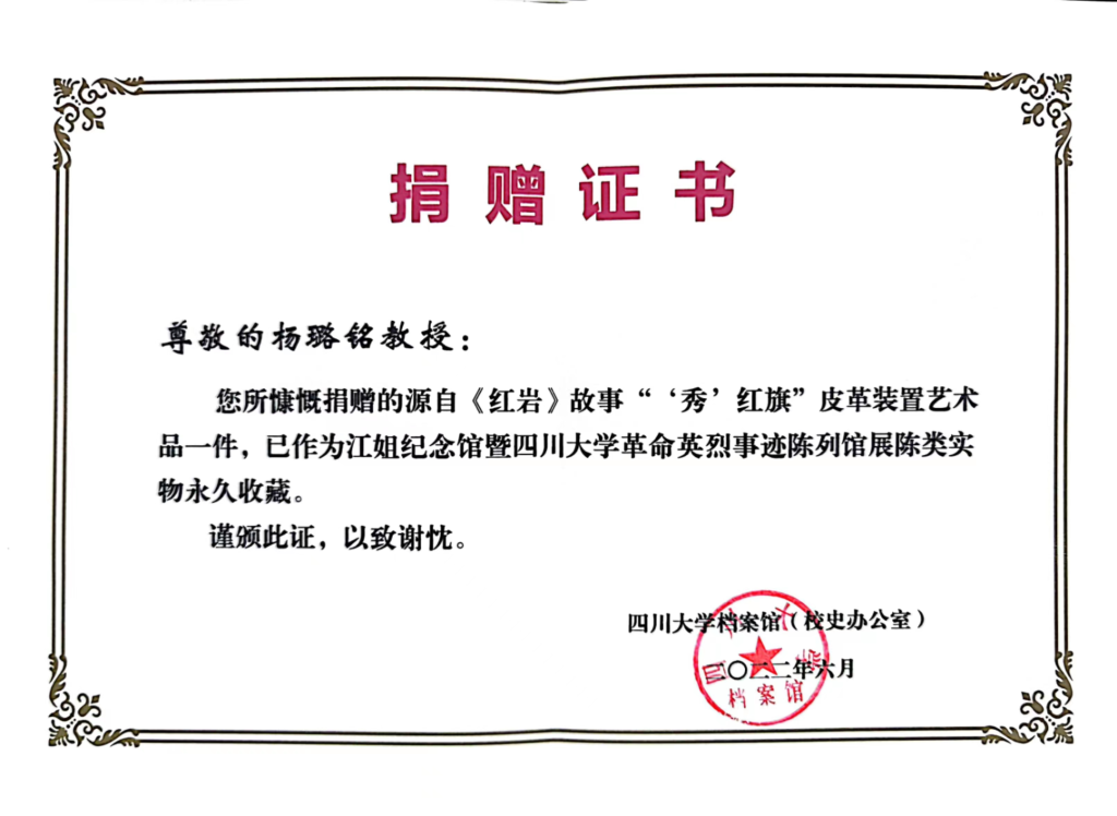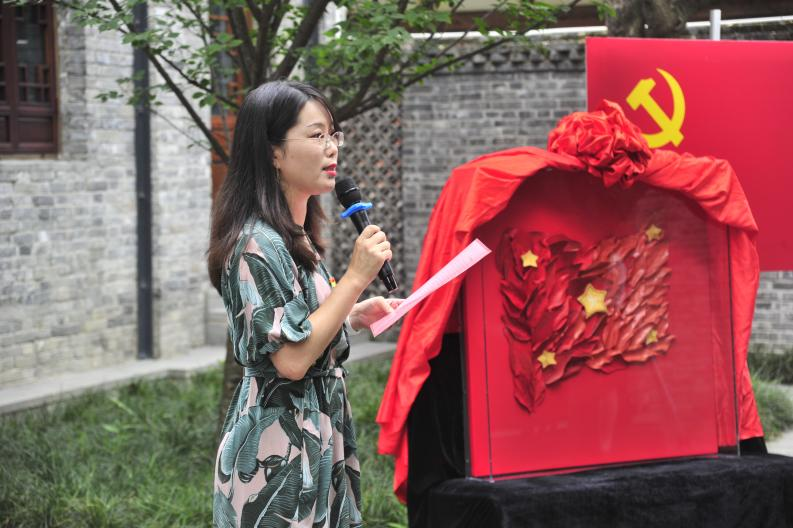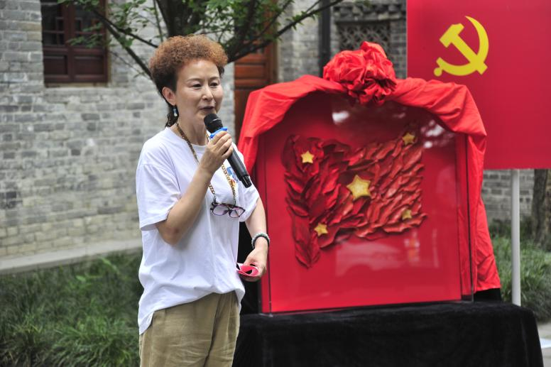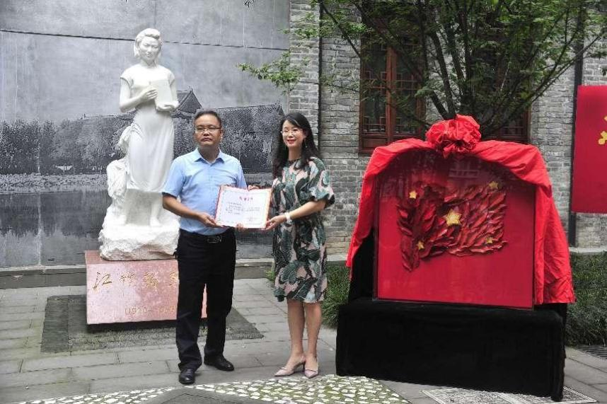 在中国共产党建党101周年之际,四川大学轻工科学与工程学院党委与四川大学校史馆�6�30日在四川大学江姐纪念馆举行了作品《“秀”红旗》捐赠仪式。成都市非物质文化遗产保护中心科技宣传科陈爱蓉科长,四川大学档案馆(校史办公室)副主任冯兵教授,四川大学档案馆(研究开发科)沈军科长,四川大学江姐纪念馆谭红副研究员,四川大学轻工科学与工程学院李天富书记、纺织服装党支部陈胜书记、服装与服饰设计系主任杨璐铭教授,纺织服装党支部全体党员出席了本次捐赠仪式。捐赠仪式由轻工科学与工程学院院长助�/人才培养与科研管理办公室祝蔚主任主持�