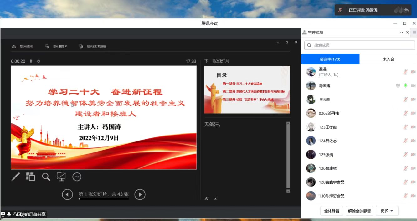 2022年12月9日下午,学院党委冯国涛副书记为2022级本科生线上讲授“学习二十大,奋进新征程——努力培养德智体美劳全面发展的社会主义建设者和接班人”专题党课。2022级本科生辅导员、学生事务办公室主任贺婷老师与2022级同学参加了本次党课学习。