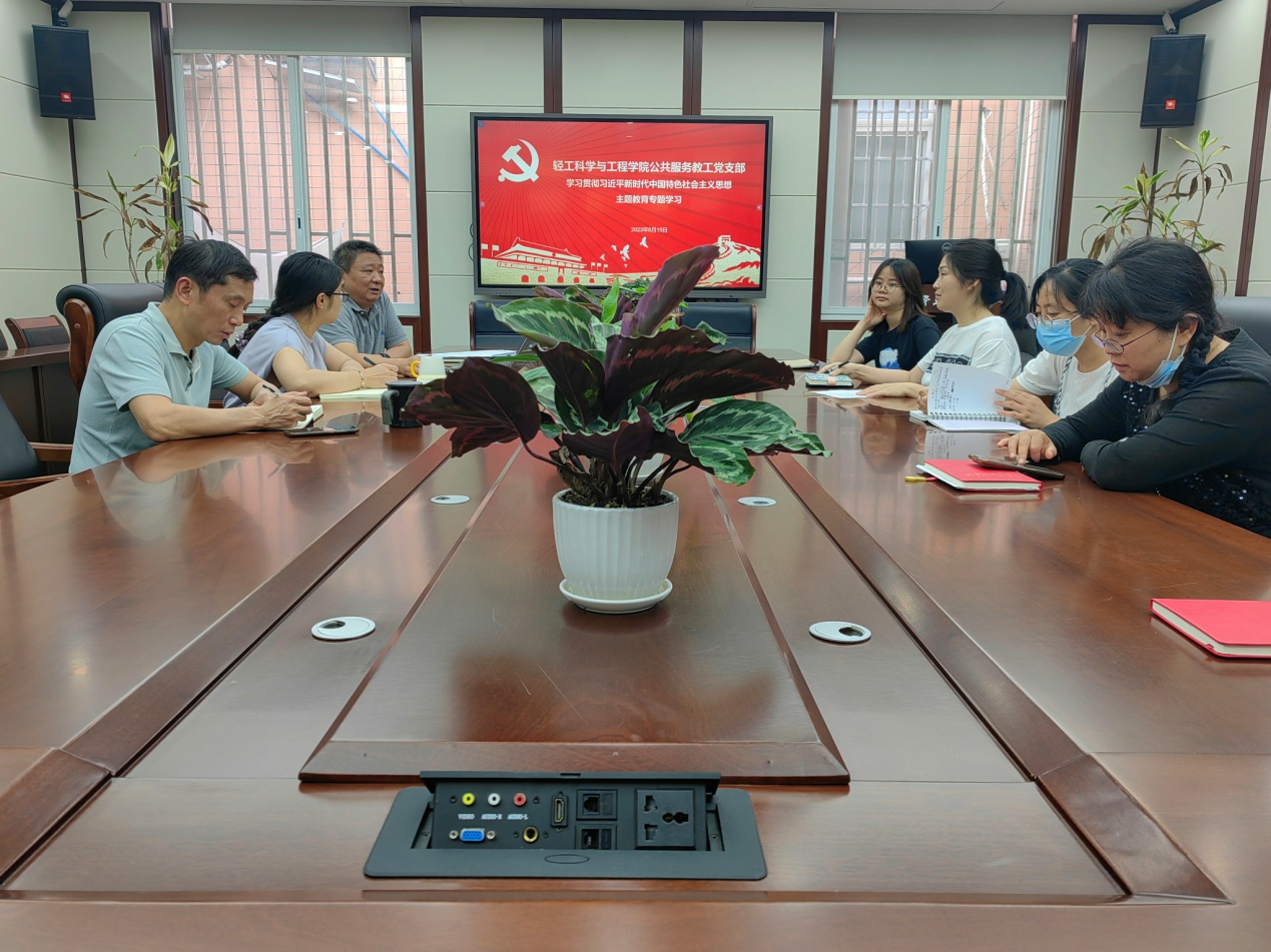 2023年6月15日下午,公共服务教工党支部在纺工附楼205会议室开展学习贯彻习近平新时代中国特色社会主义思想主题教育专题学习,支部全体党员参加了此次会议。