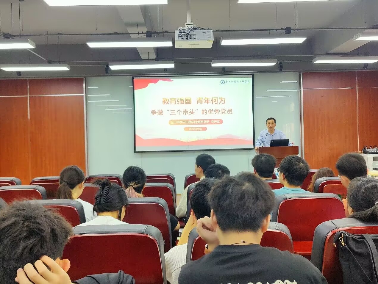 委员会关于加快推进学校高质量发展助力教育强国建设的决定》,贯彻落实“学院党委书记、院长每学期至少分别为学生上一次思想政治理论课”的工作要求,更好地推动一流中层领导班子、一流党员队伍和一流党组织(以下简称“三个一流”)建设,同时激励本科生党员激扬青春、坚定信念,2024年6月7日上午,学院党委李天富书记为本科生党员讲授“教育强国,青年何为——争做‘三个带头’的优秀党员”的形势与政策课暨专题党课。本次活动由2020级本科生辅导员余昕玲老师主持,学院全体本科生党员参加。