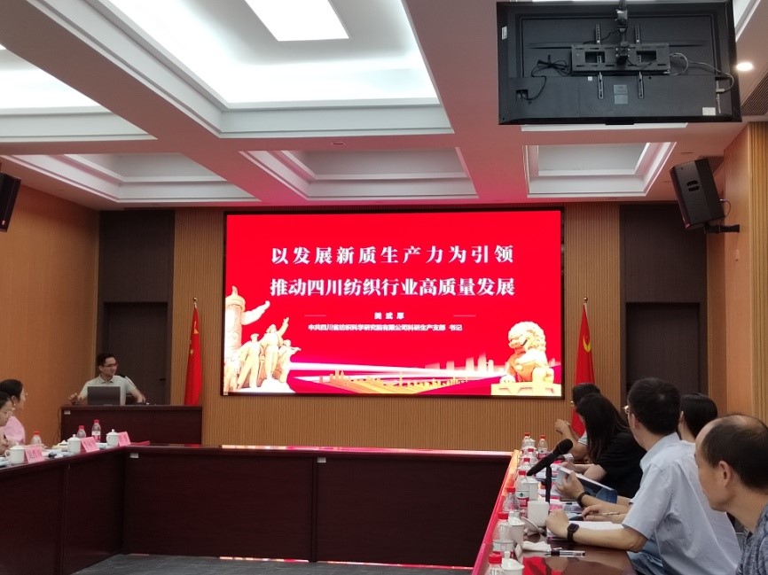 随后,在纺科院行政办公楼第一会议室,开展了主题党日学习和交流活动。省纺科院党委书记马德武致欢迎词,介绍了纺科院的历史沿革及发展情况,并表示,在当今快速变革的市场环境中,企业要抓住机遇,抢抓科技创新的脉搏,以人才为基础,以技术创新为动力,推动新材料和工艺技术的转化和应用,为行业注入新活力,实现纺织行业的跨越式发展。纺织服装教工党支部书记陈胜为省纺科院对此次主题党日活动的支持表示感谢,并简要介绍了我院纺织服装教工党支部的组成和教学科研等方面的基本情况。随后,陈胜书记与樊武厚书记分别以“新质生产力驱动下的纺织科技创新需求”和“以发展新质生产力为引领,推动四川纺织行业高质量发展”为主题进行了党课讲授,深入讲解了新质生产力的内涵、特点和时代意义,以及如何利用新质生产力推动纺织行业的高科技创新和产业升级,实现纺织产业的高质量、可持续发展目标�