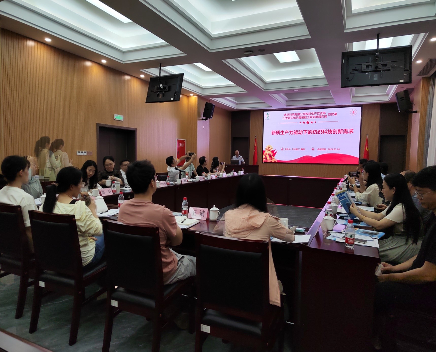 党课学习后,我院教师介绍了各自在纺织新材料、服装设计与制造等方面的研究方向和新技术成果,省纺科院参会人员介绍了各自取得最新科技成果及应用转化情况,以及公司的新技术需求。双方共同探讨了当前纺织产业面临的困难和挑战,并期望结合双方各自特点,探索可行的合作科研方向及合作方式,发挥好高校、院所和科技型企业的协同作用,打通科研成果产业化、产业需求技术化的路径,推动四川省纺织行业高质量发展。双方人员就个人科研方向进行了热烈的交流�