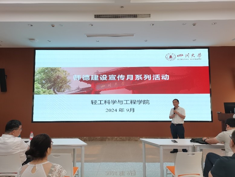 在皮革楼工业互联网中心召开全院教职工大会,开展师德建设宣传月主题活动。会议由学院党委副书记兼纪委书记冯国涛主持。
