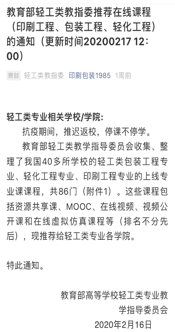 本次推荐使用的线课程资源为我�40多所学校�88门专业课程。课程涵盖轻工类包装工程、轻化工程、印刷工程等专业,包括资源共享课、MOOC、在线视频、视频公开课和在线虚拟仿真课程等。这些优质的线上教学资源,为轻工类院校及专业在疫情防控背景下开�线上教学工作提供了有力的支撑�